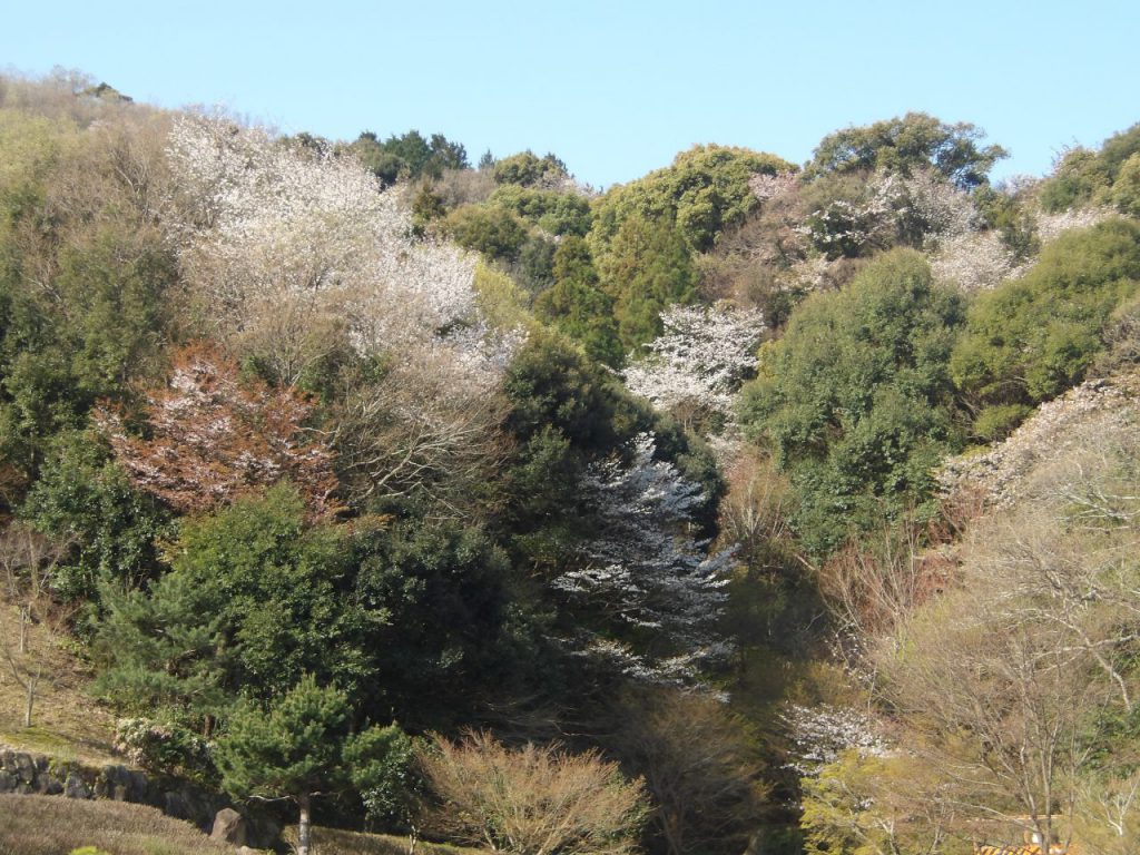 山の濃い緑色の中に薄ピンク色の桜が映えて、とてもきれいです。