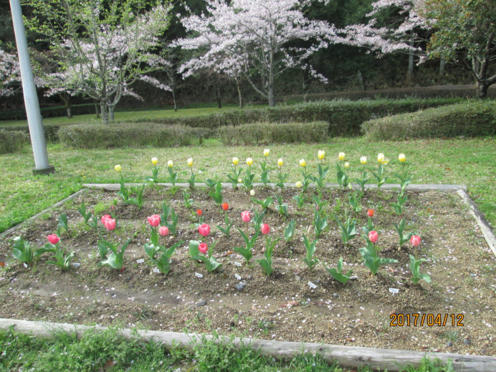 他にも入口広場にある東郷東こども園の花壇では、昨年秋にこども園の年長さんが植えてくれたチューリップが咲き始めました(*^_^*)