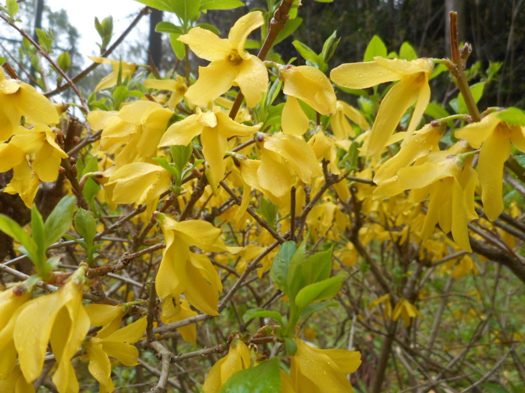 わんぱく広場、ニュースポーツ広場ではレンギョウが園路を彩ってくれています。