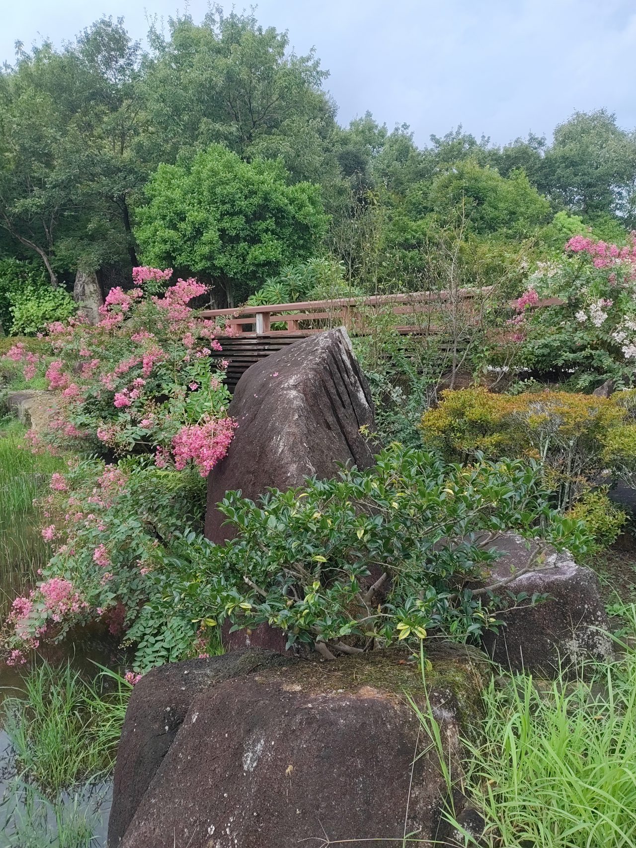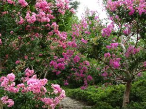 日本庭園で、低木の「サルスベリ」がきれいに咲いています。