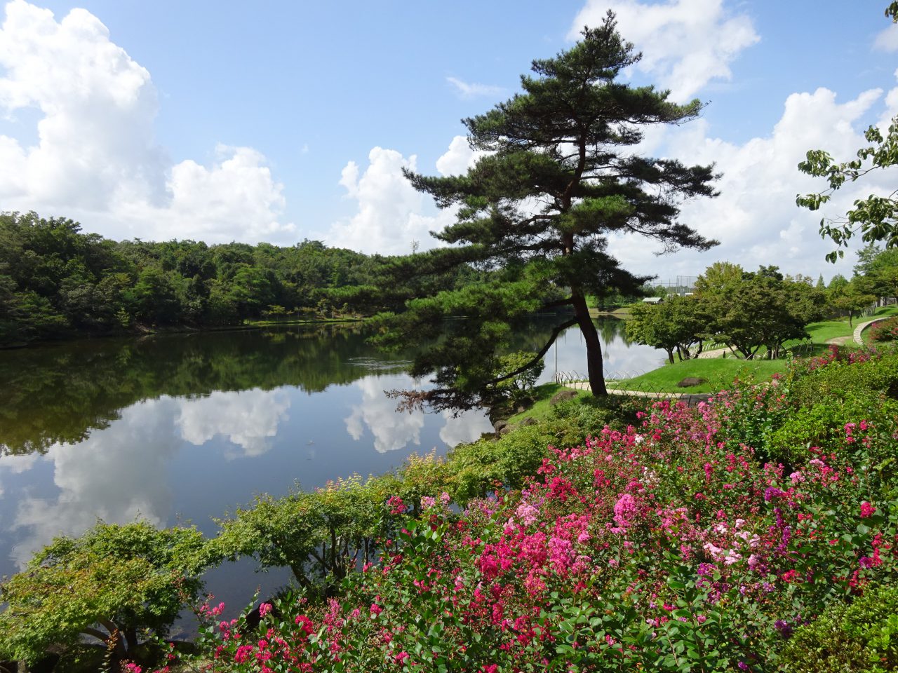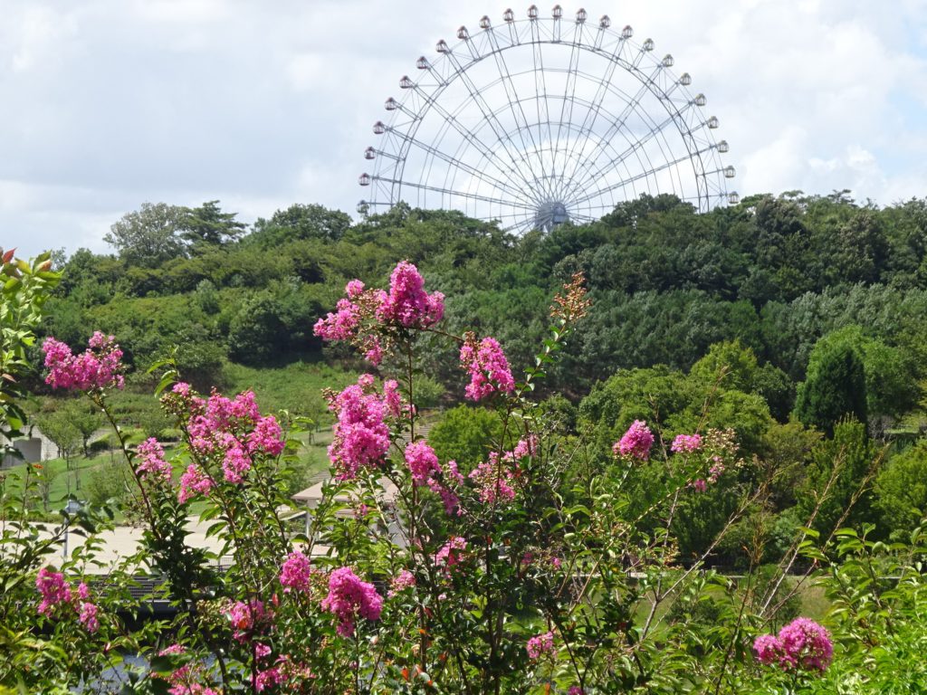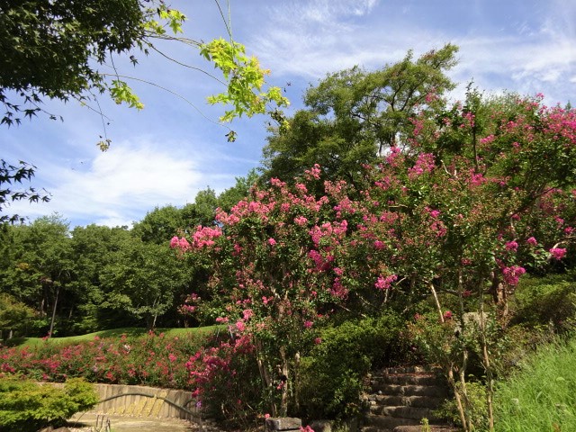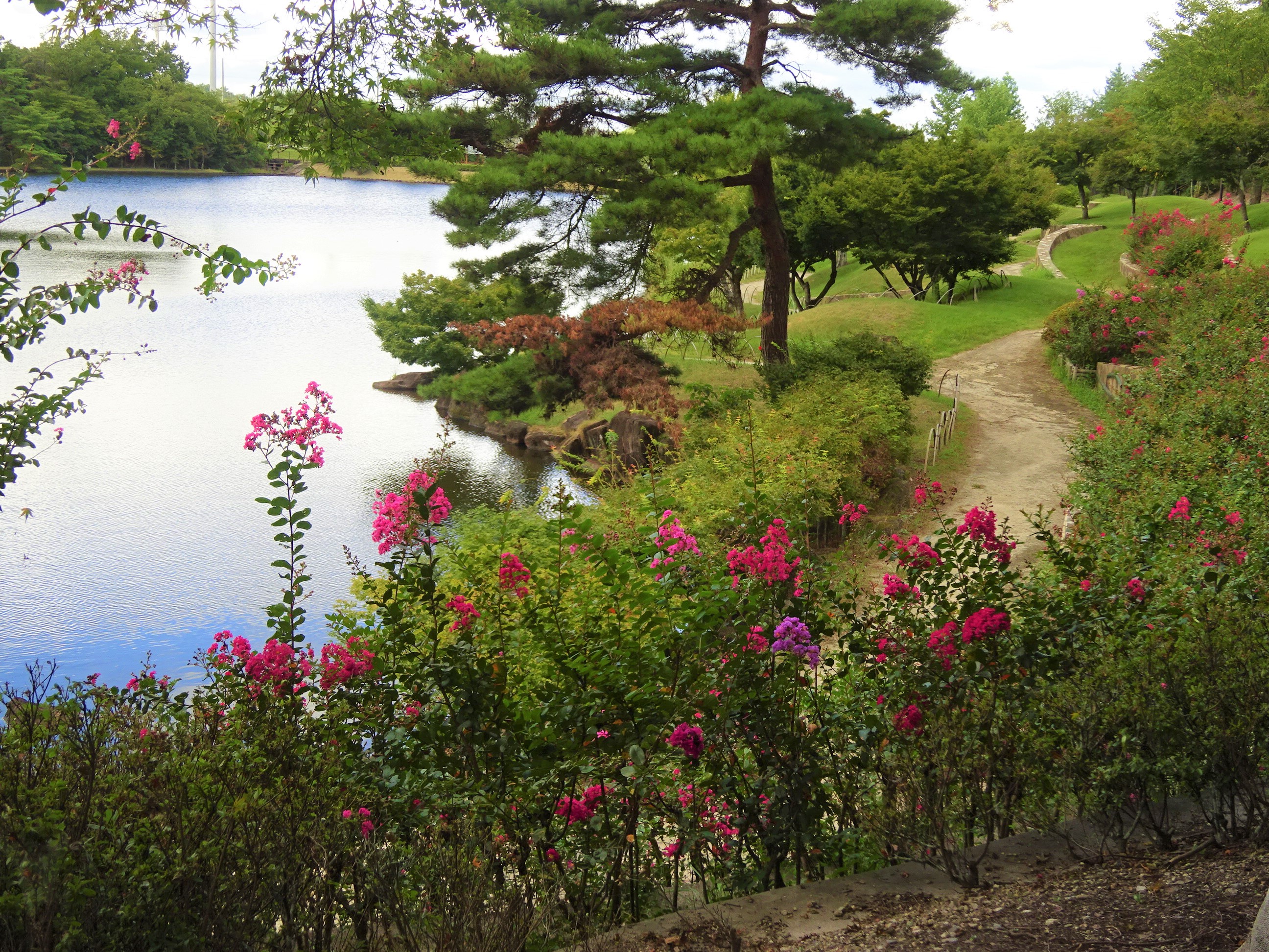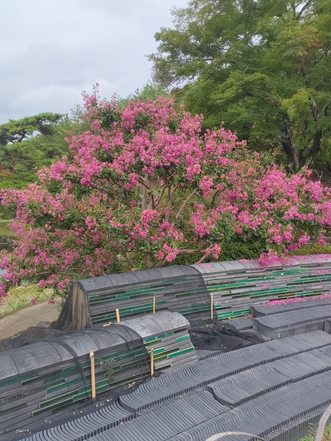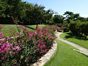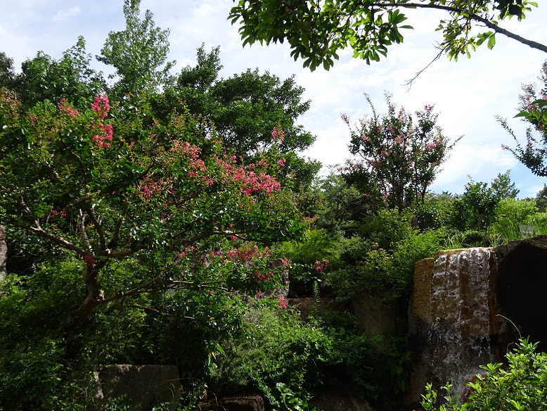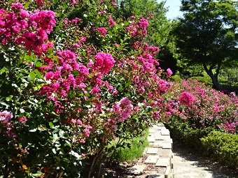 園内では大花壇や日本庭園の至る場所で「サルスベリ」が見頃を迎えています。