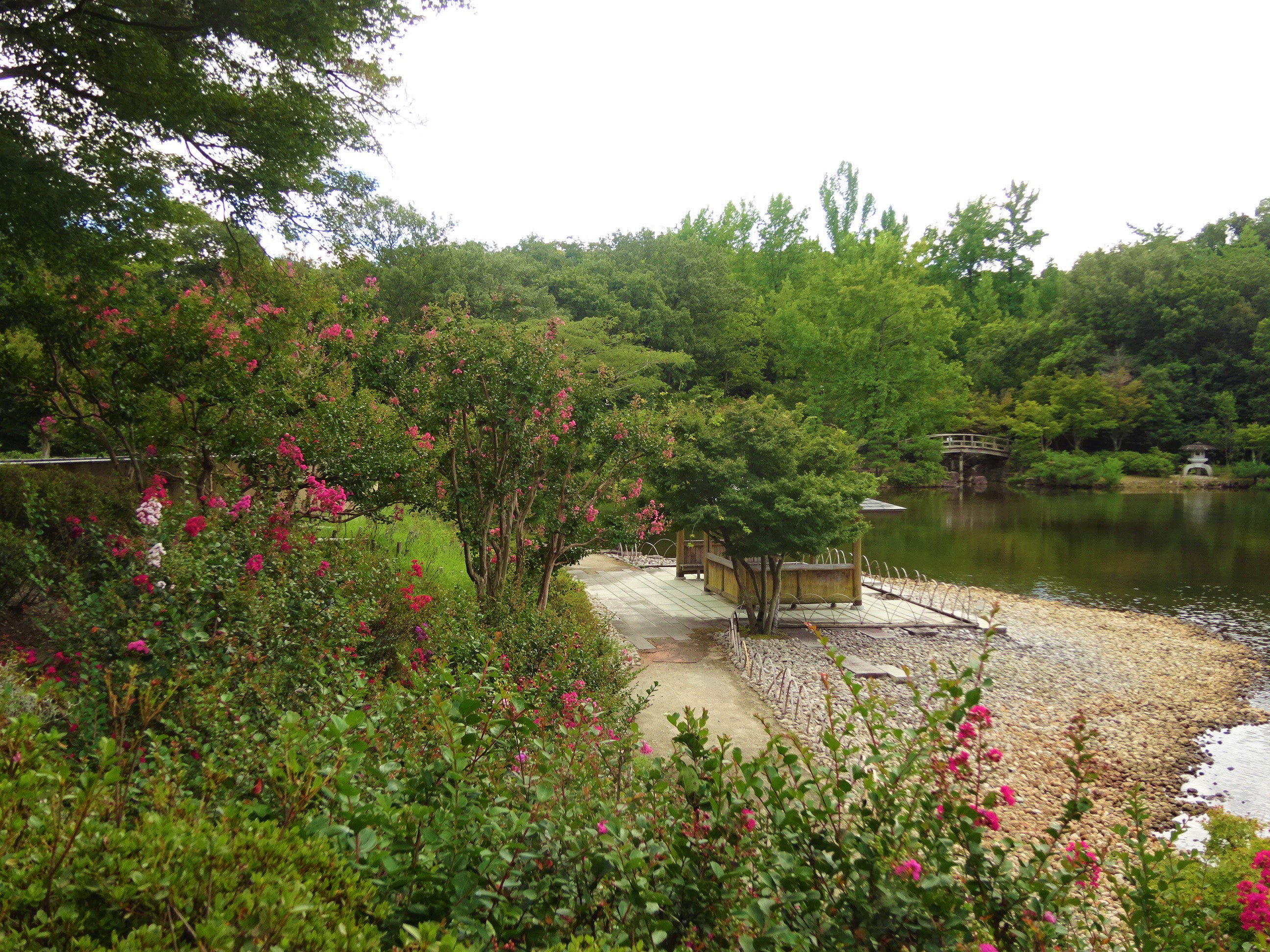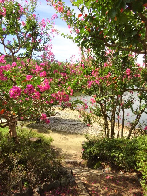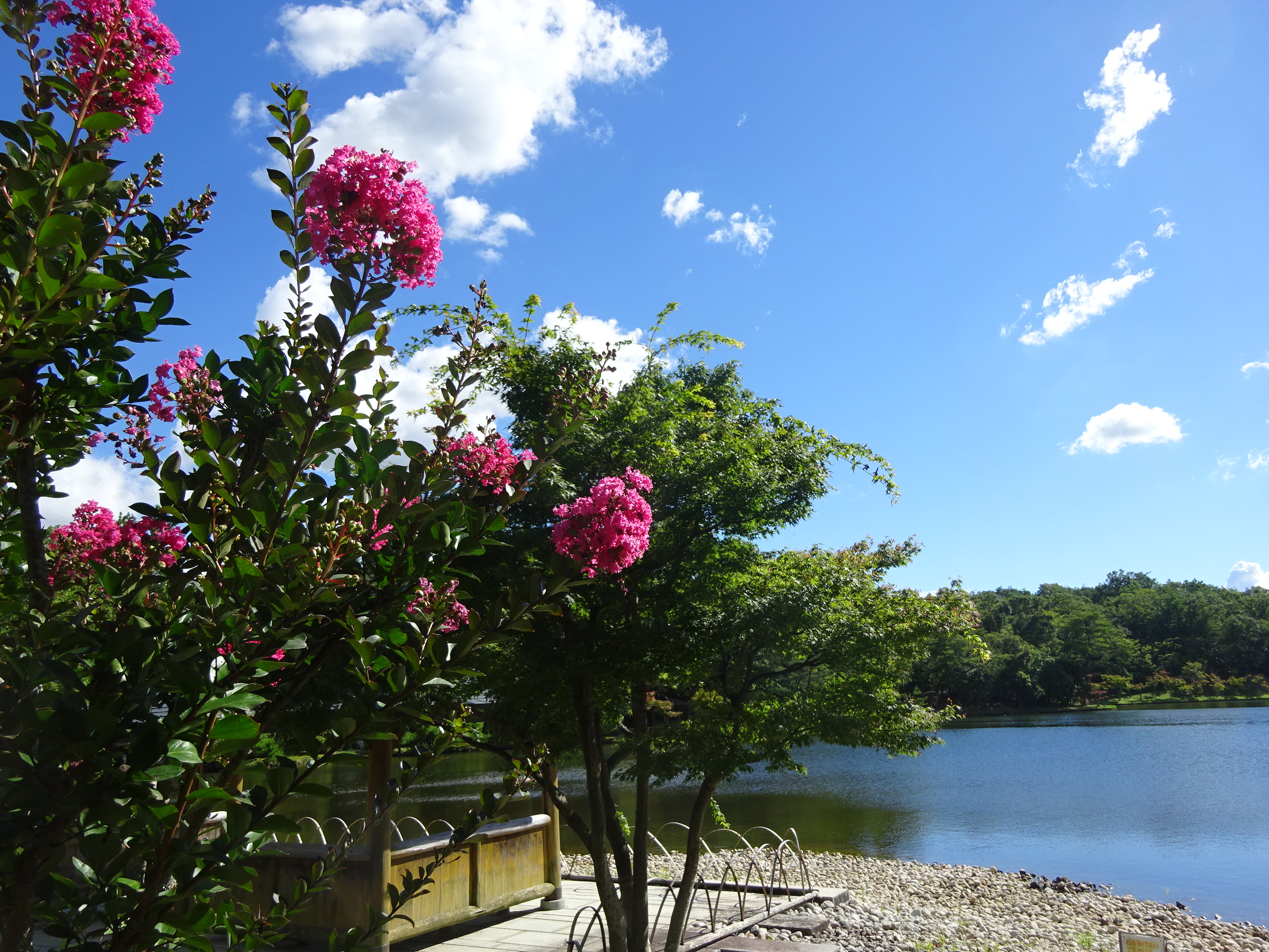 日本庭園、かえで池のほとりでサルスベリが鮮やかに咲きはじめました。