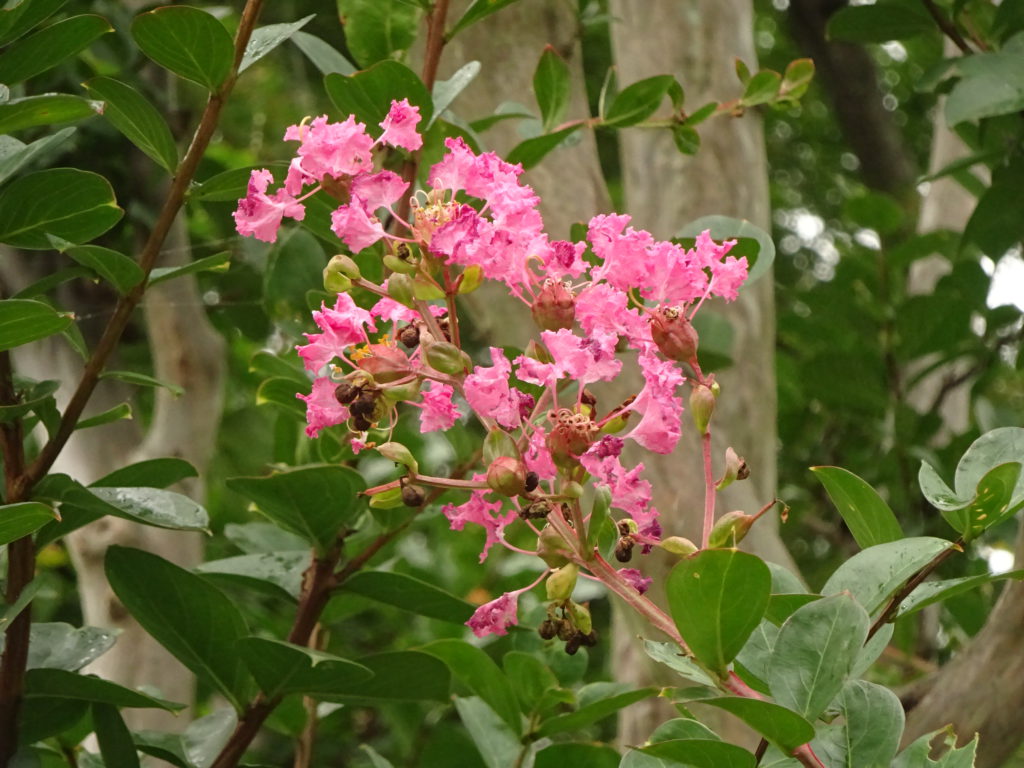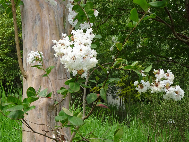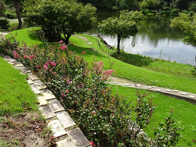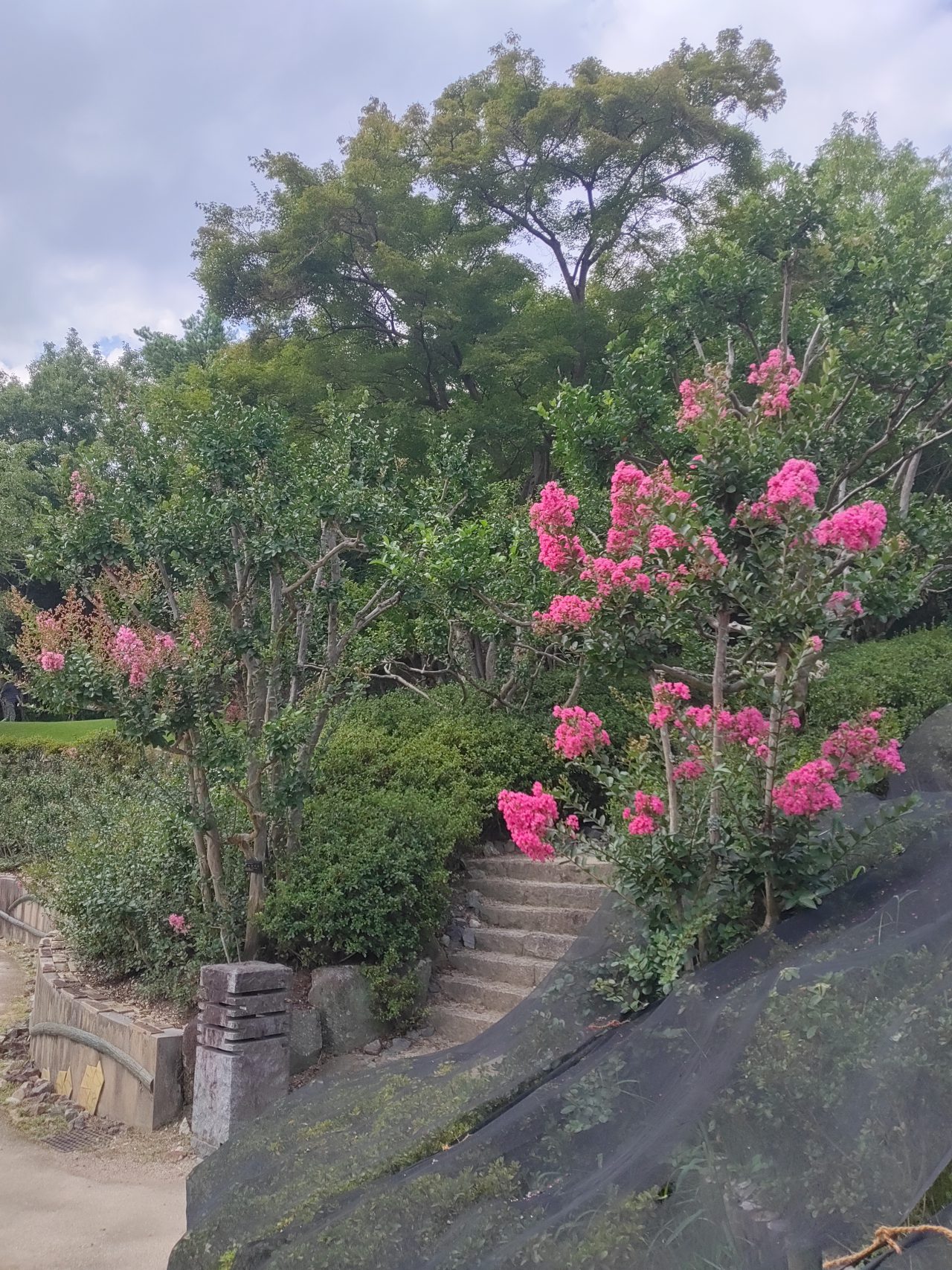 そしてこれは、日本庭園の遊歩道。低木のさるすべり。バス停の大きな幹のものと違って見上げなくても楽しめます。
