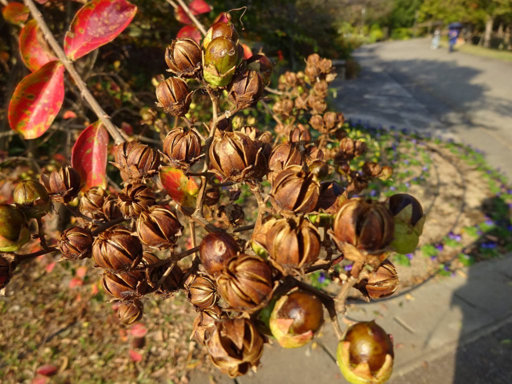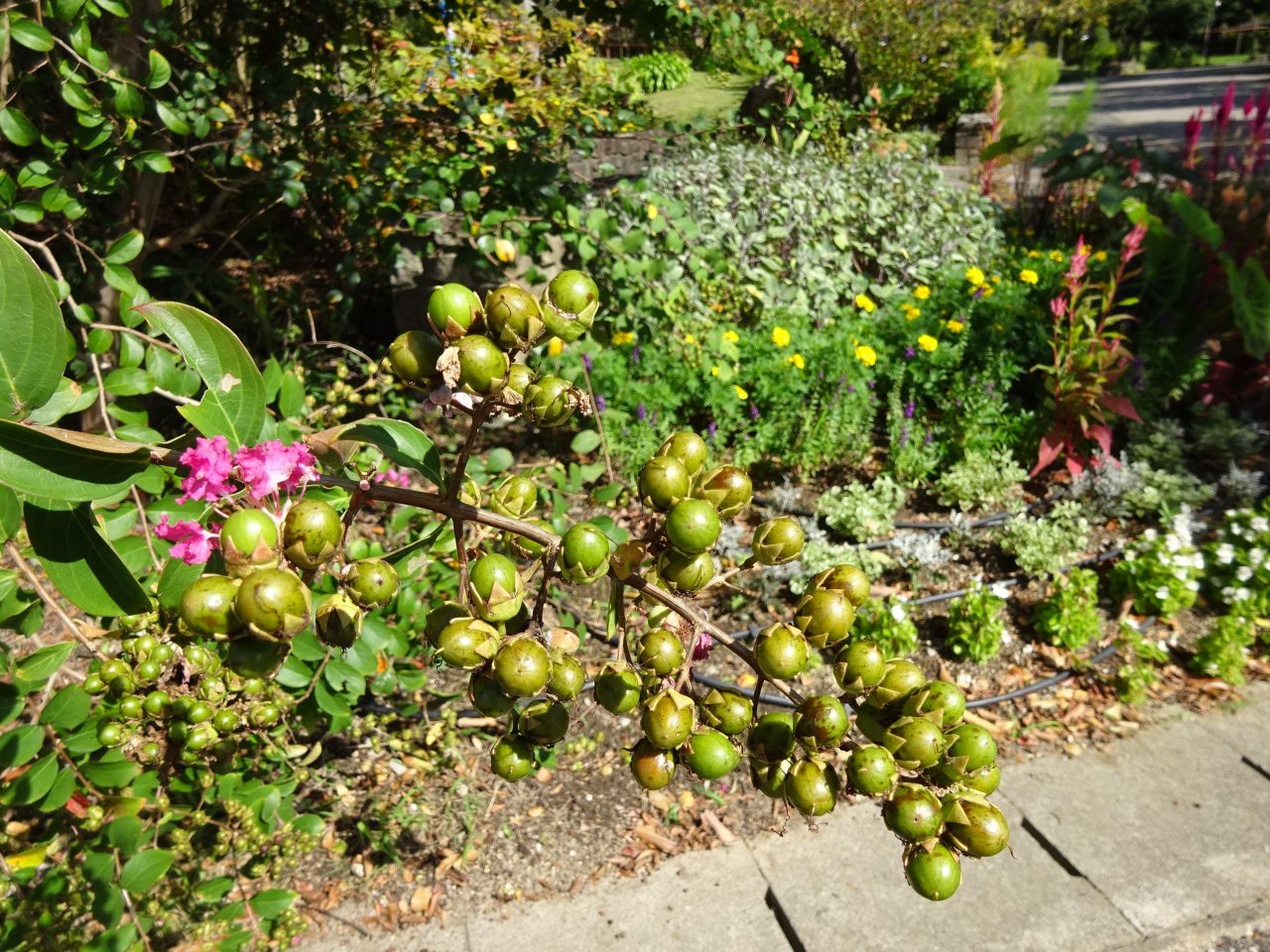 大花壇の「サルスベリ」、花はほとんど終わってしまいましたが、そのあとに実がたくさん付いていました。