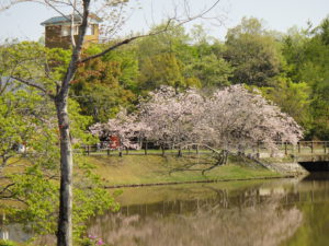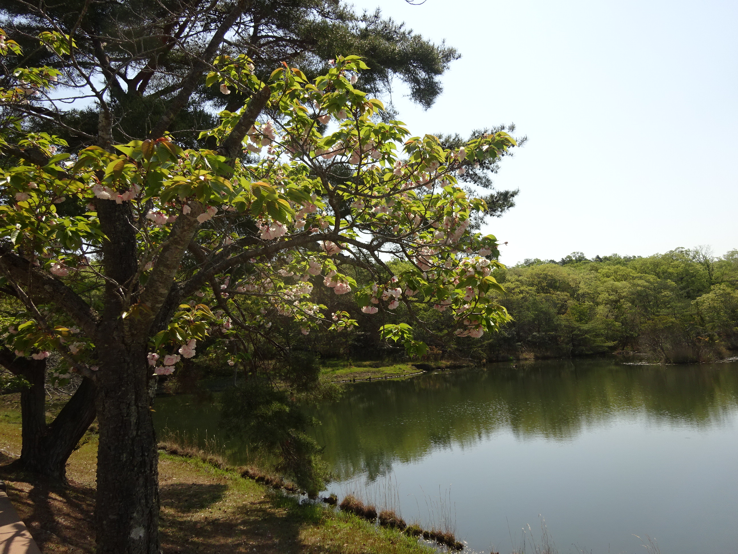 フィールドセンターに咲くサトザクラは『かめの池』と一緒に撮れるおすすめのスポットです。