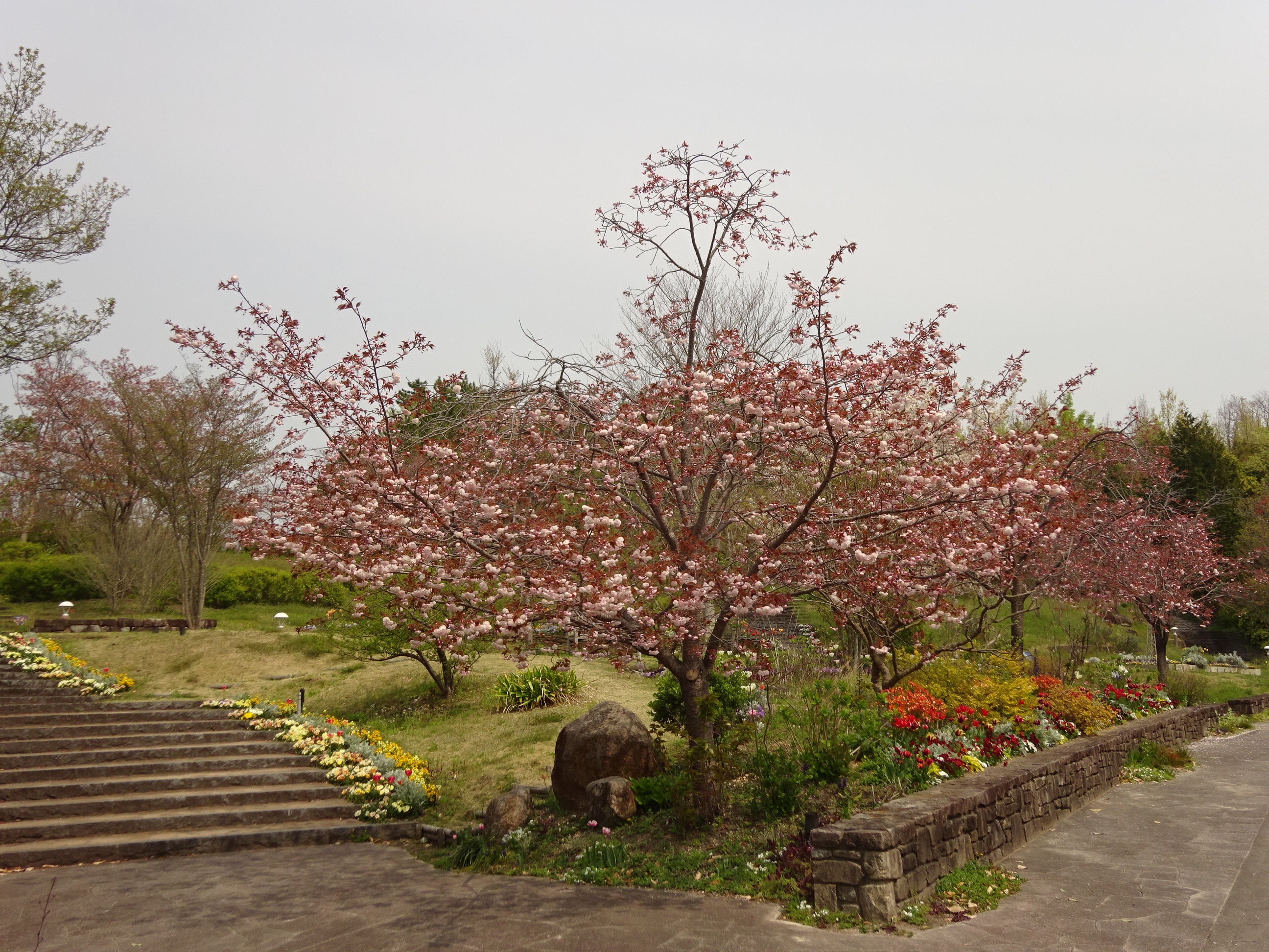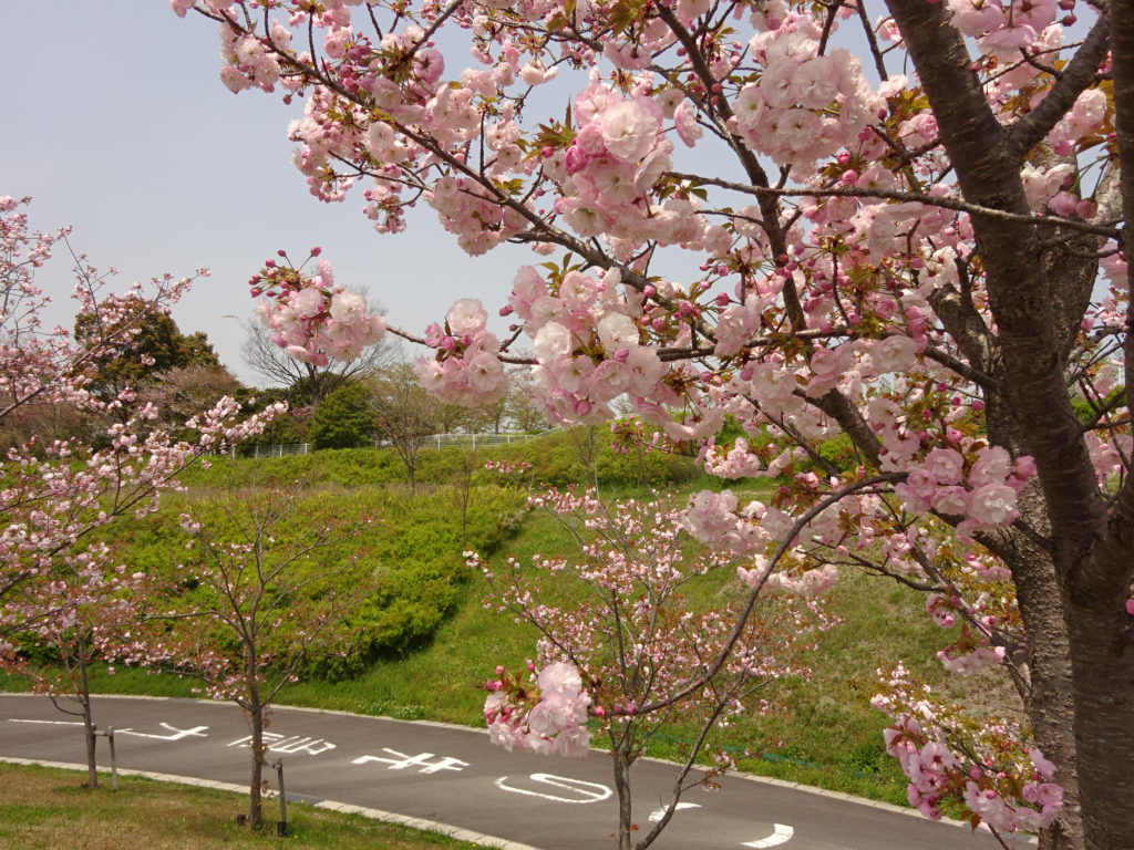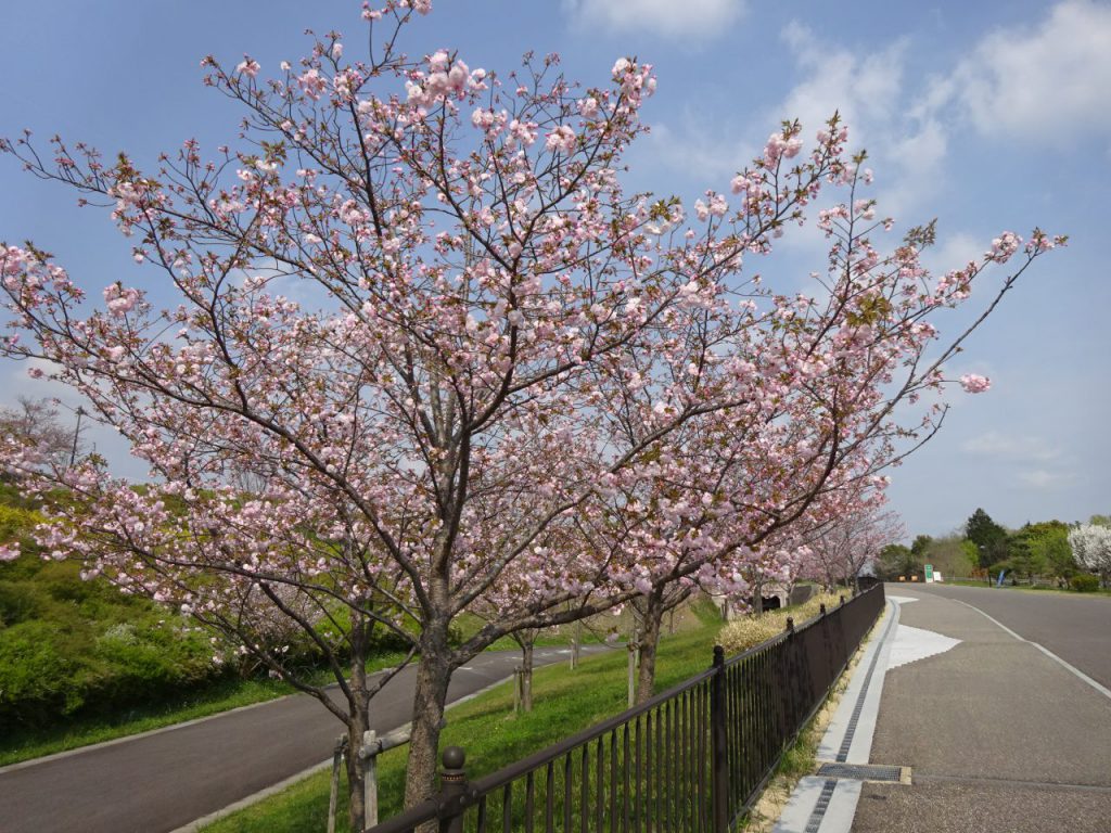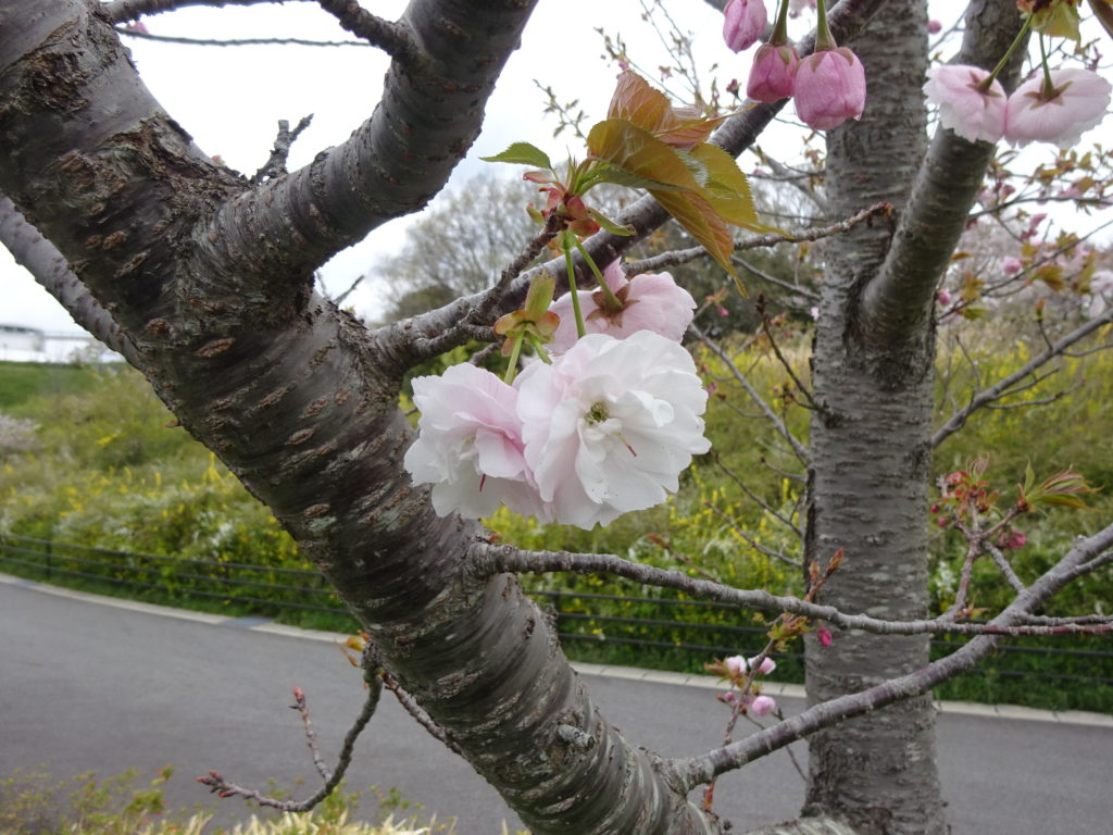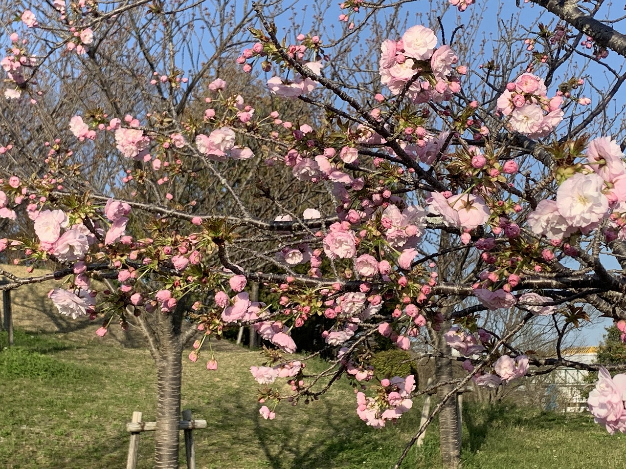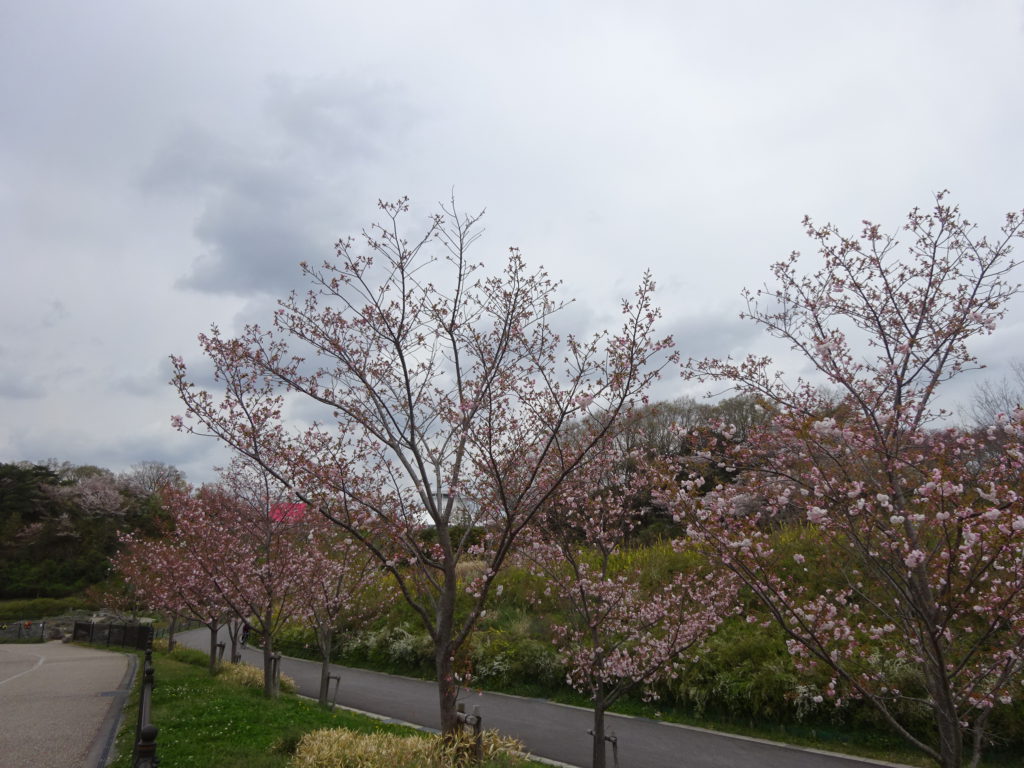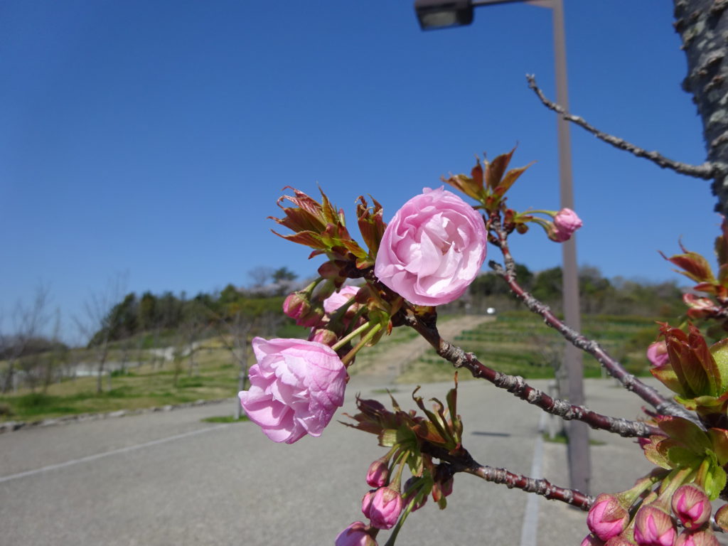 モリコロパーク内にもいくつかサトザクラがありますが、花の広場休憩所近くの園路にあるサトザクラが一番に開花しました。