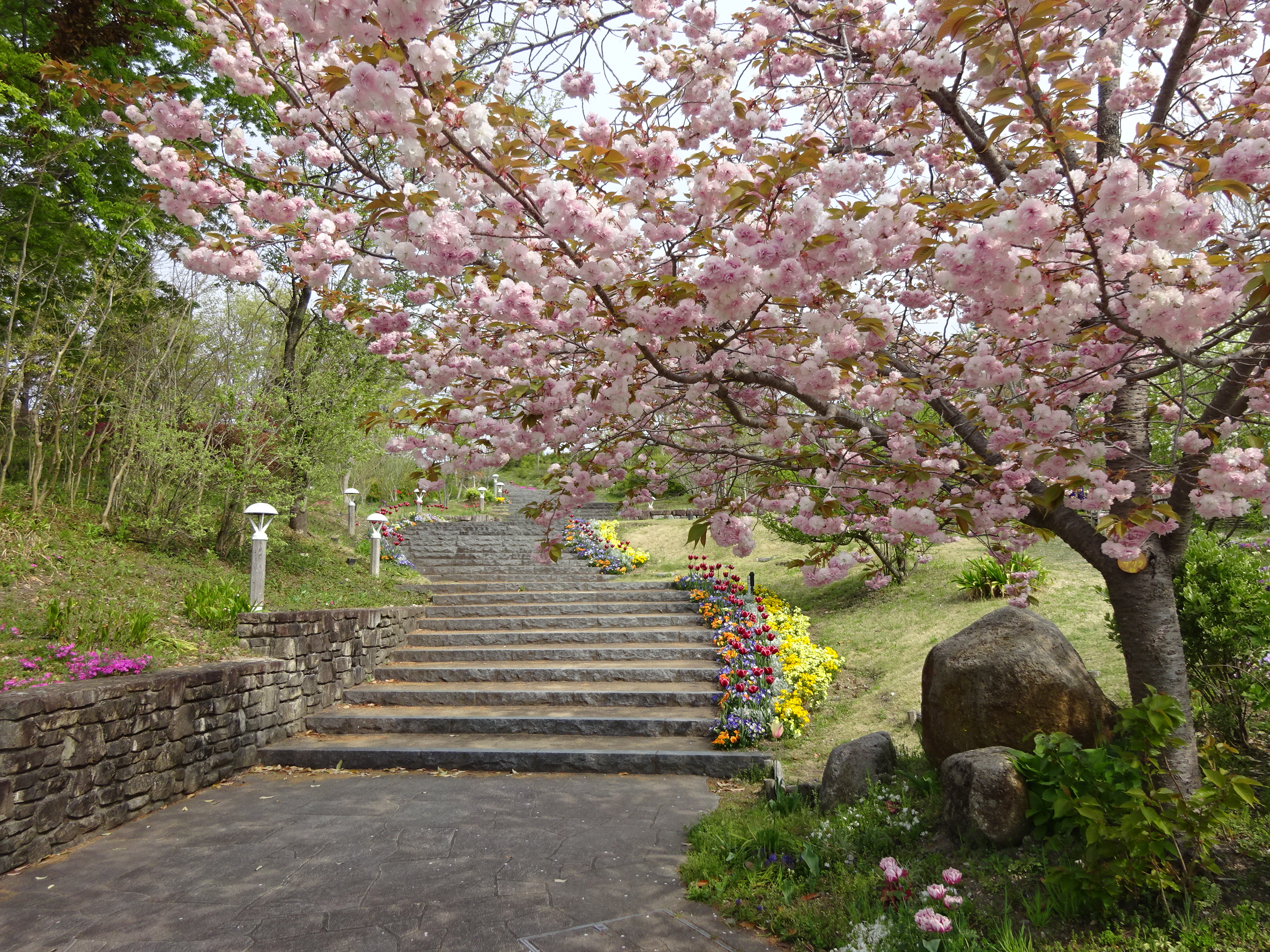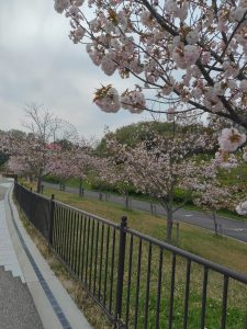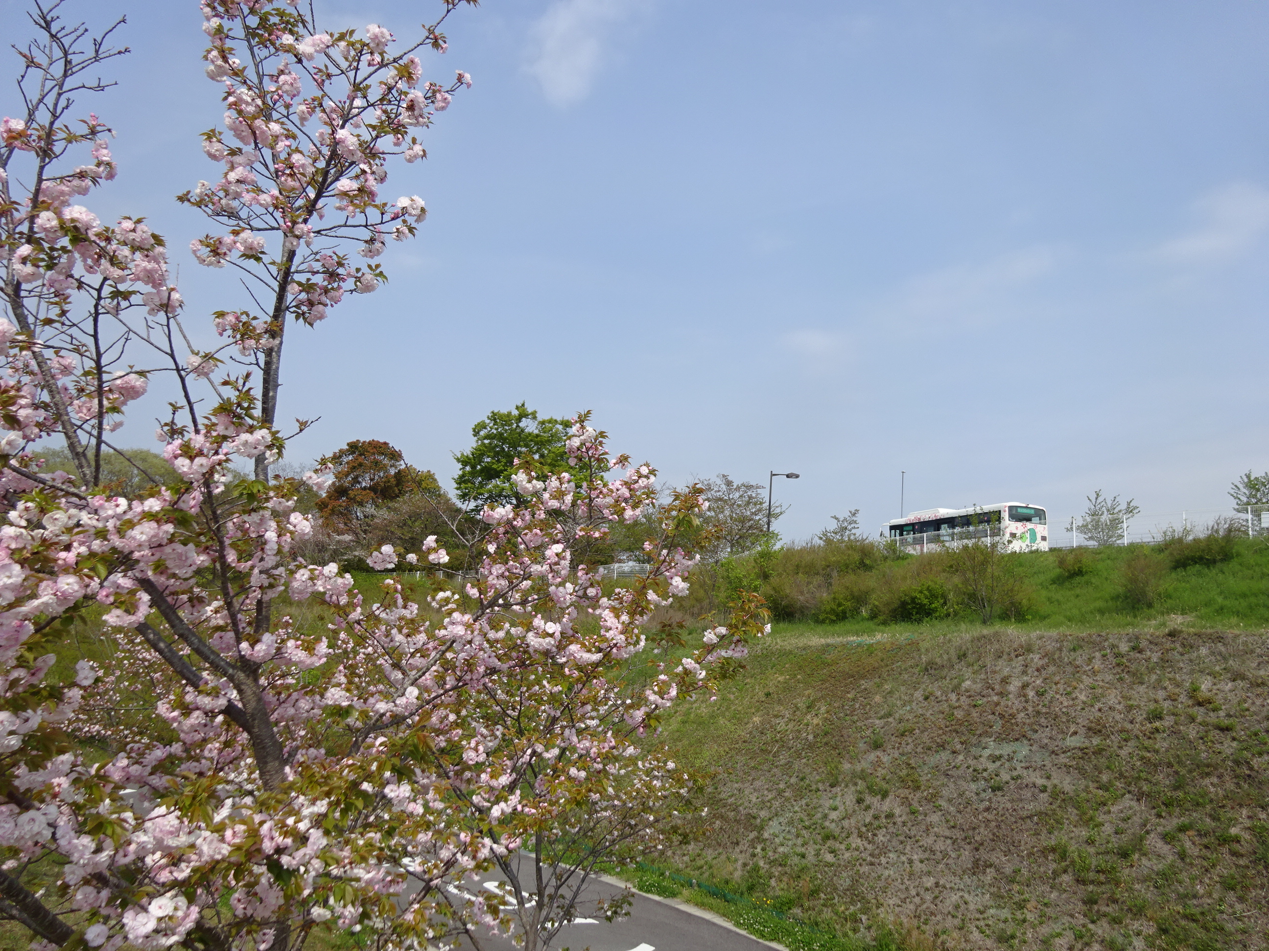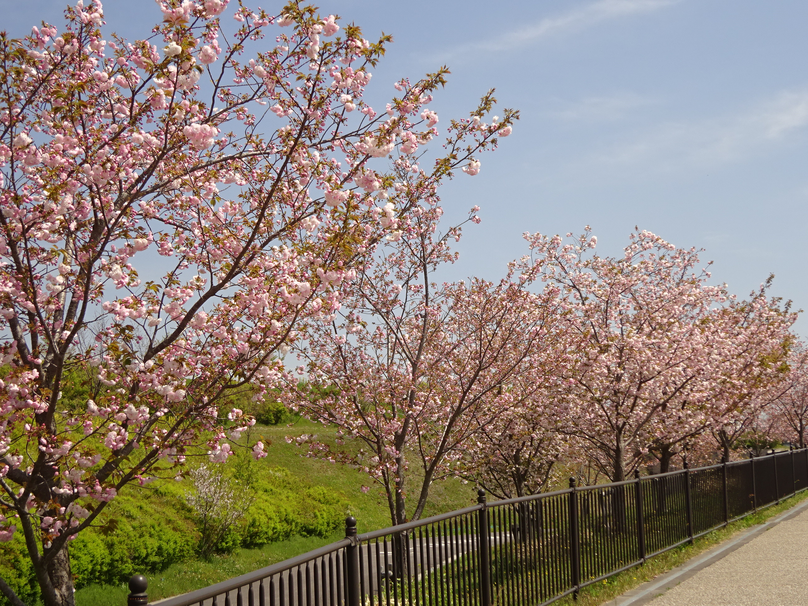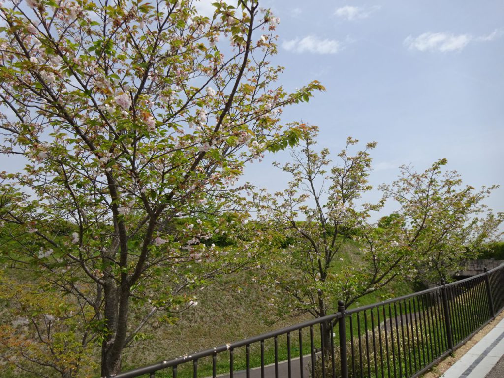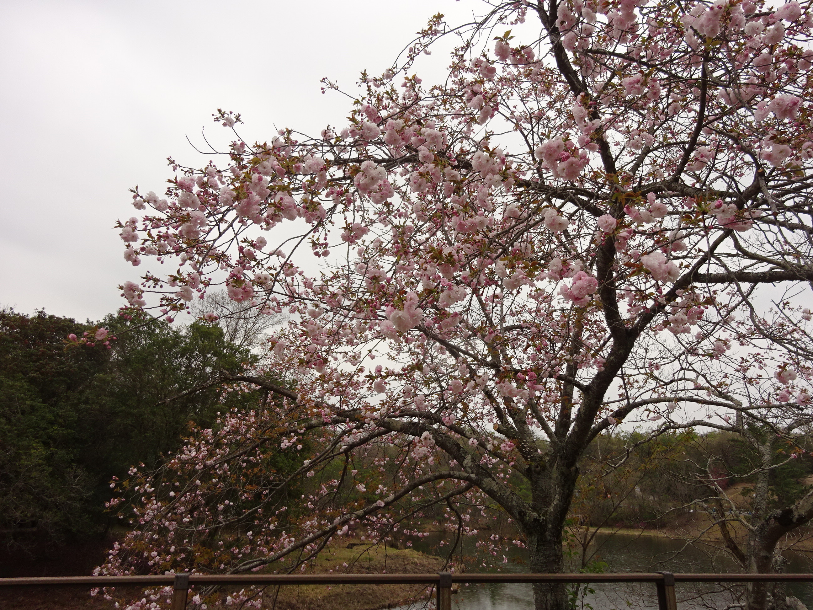 モリコロパーク内にもいくつかサトザクラがありますが、花の広場休憩所近くの園路にあるサトザクラが一番に開花しました。