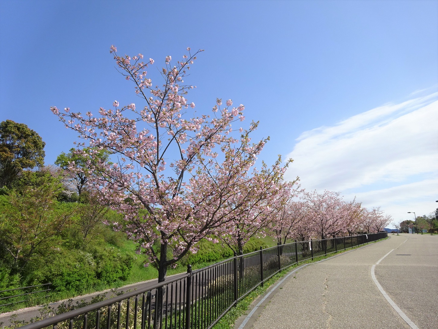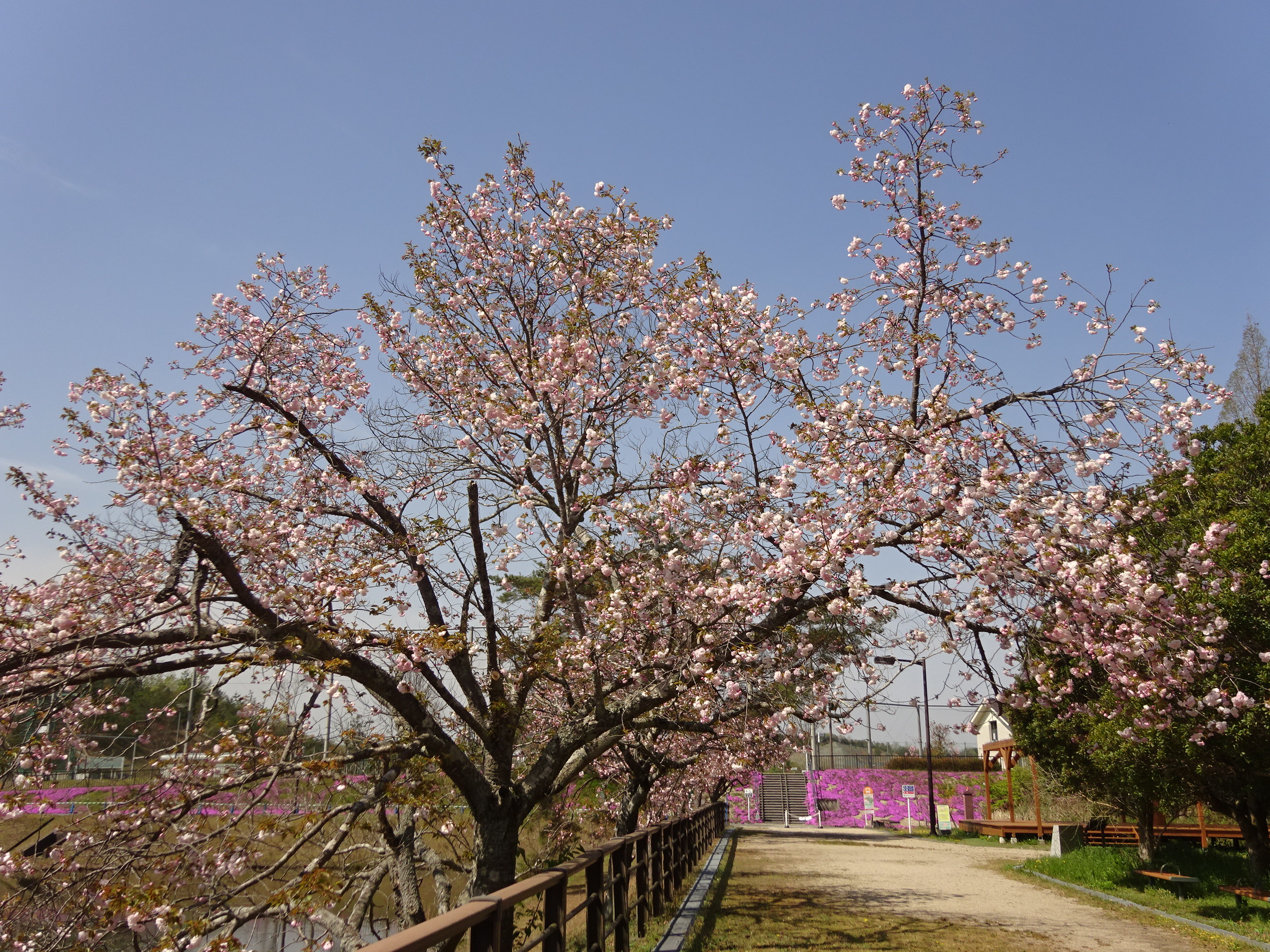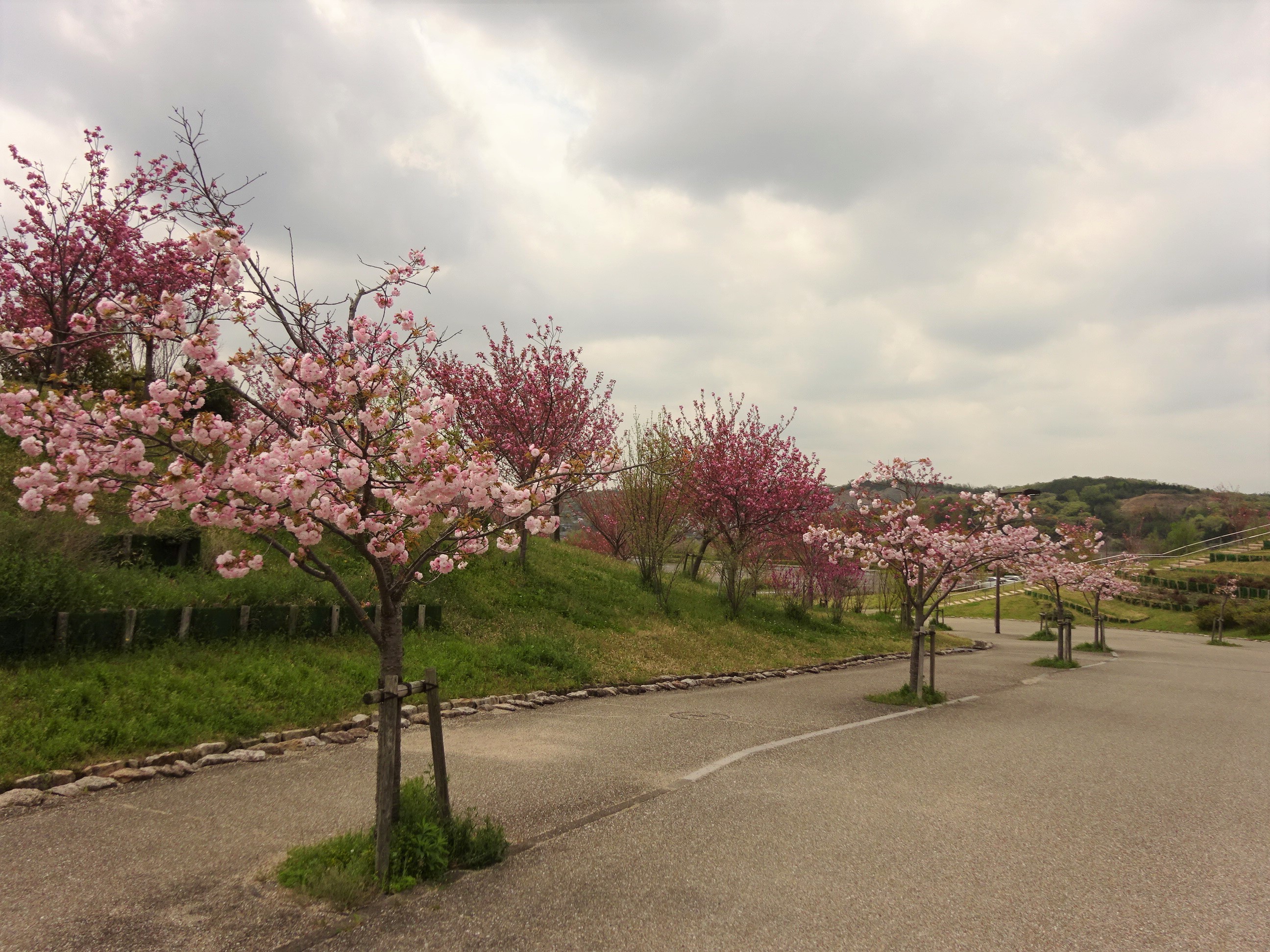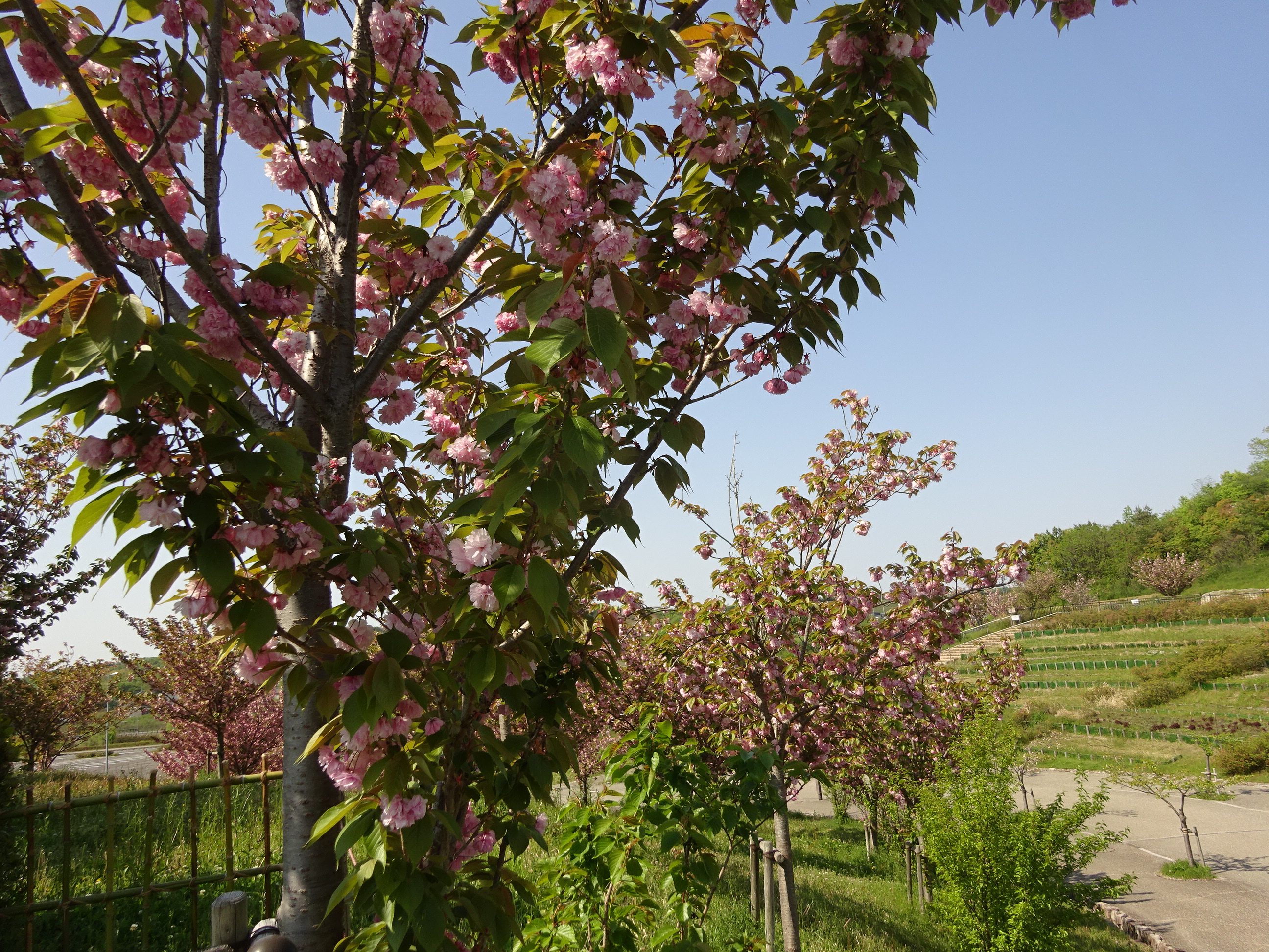 はなもも畑から西エントランス広場へ続く道にもサトザクラ、奥にはカンザンも咲いています。