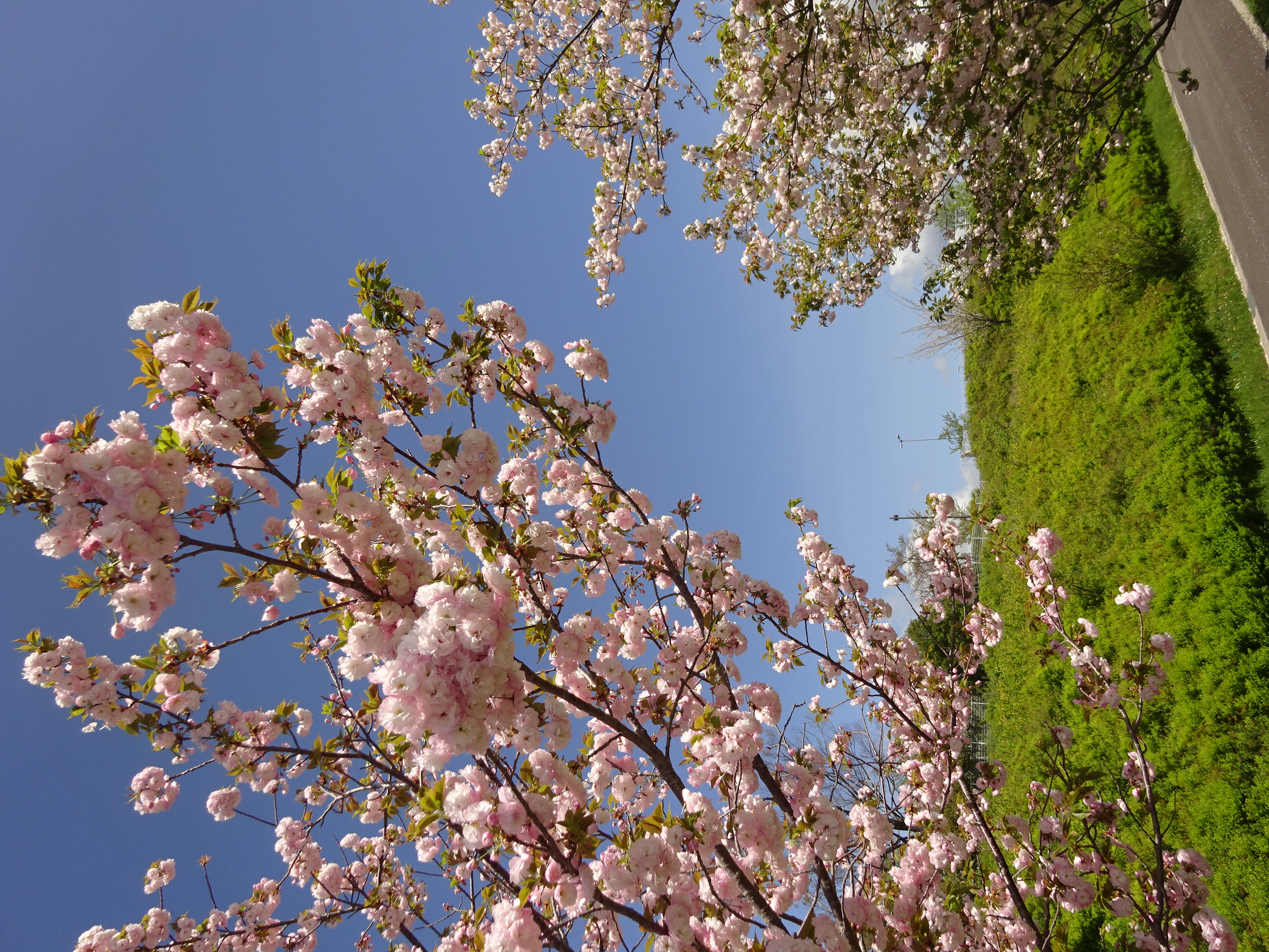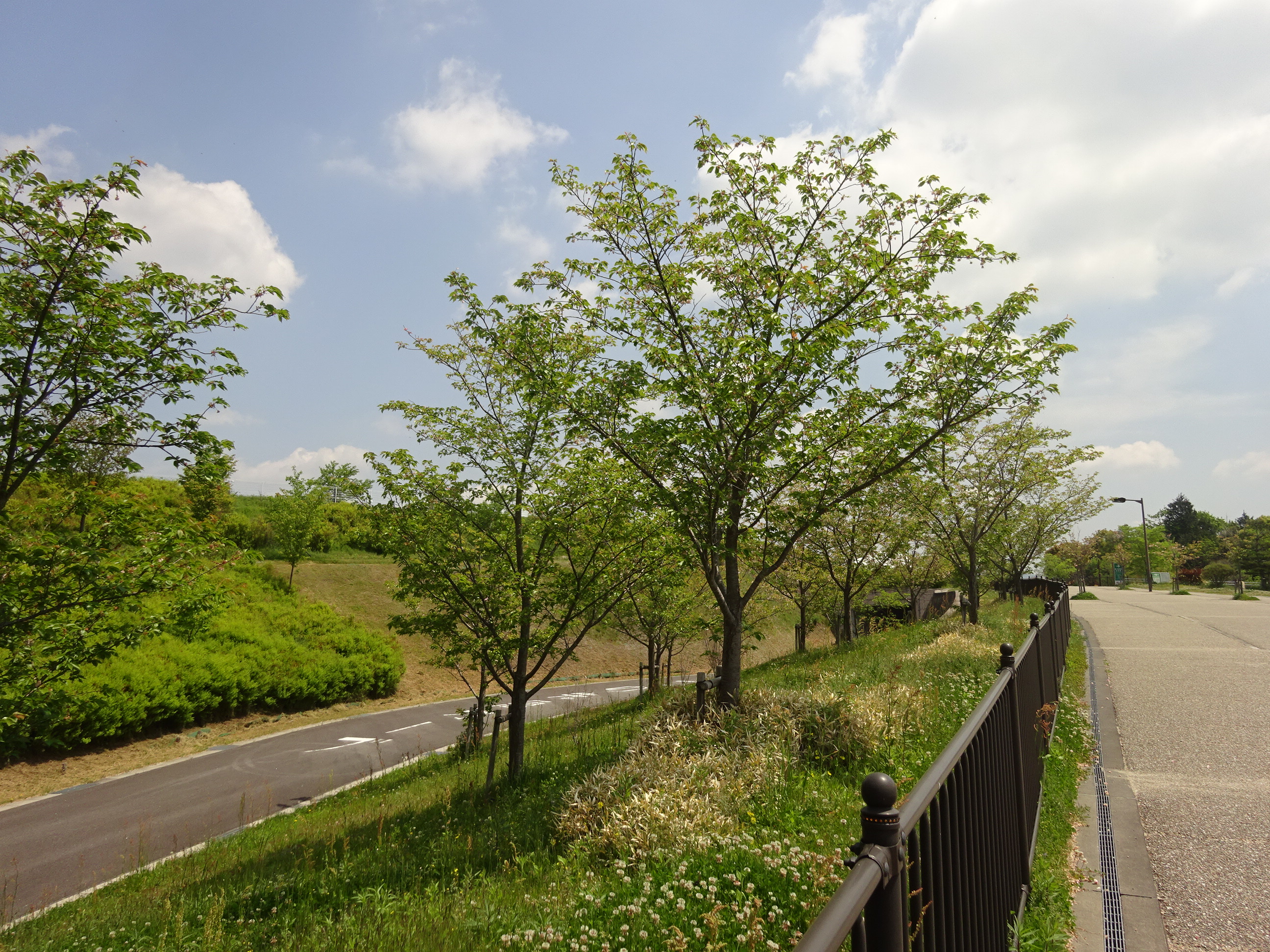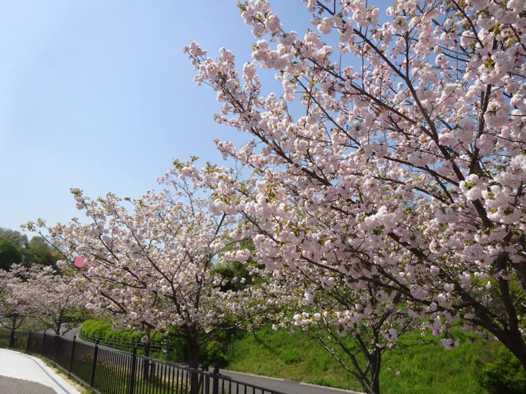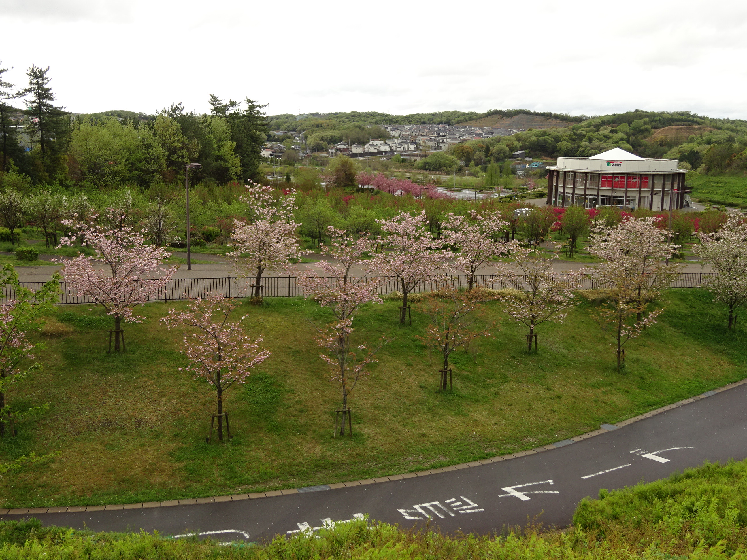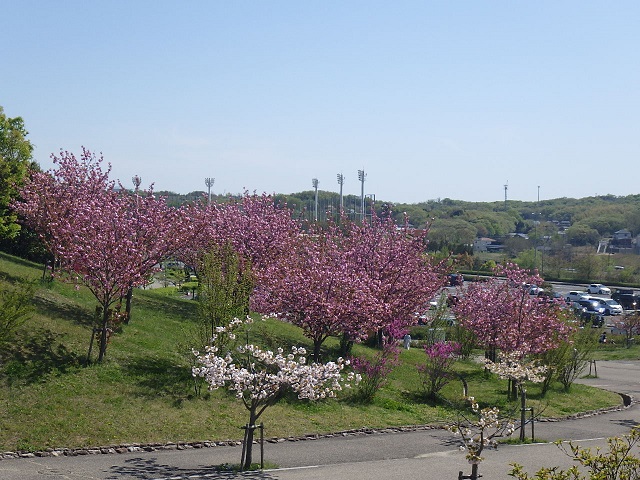はなもも畑から西エントランス広場へ続く道にもサトザクラ、奥にはカンザンも咲いています。