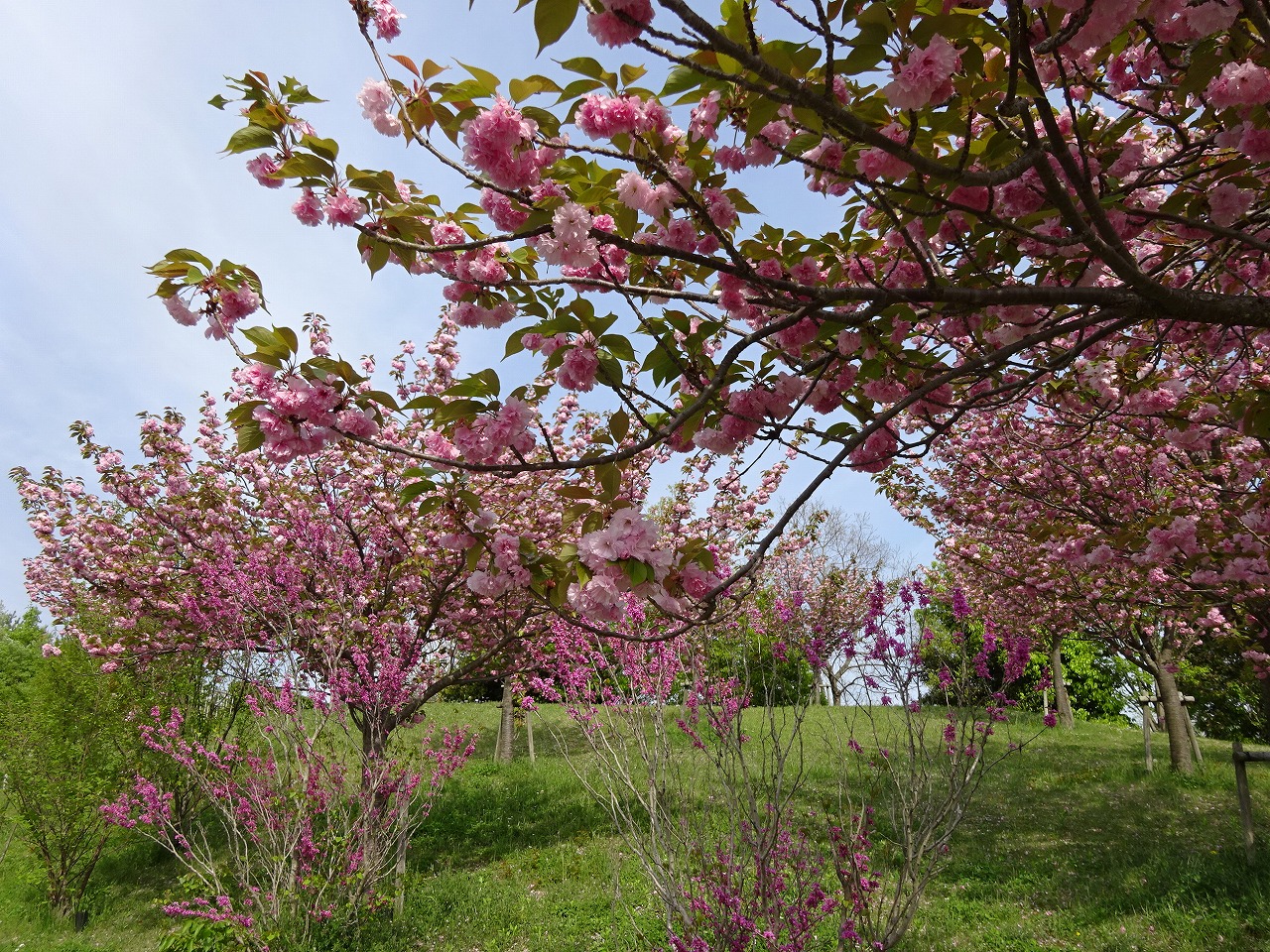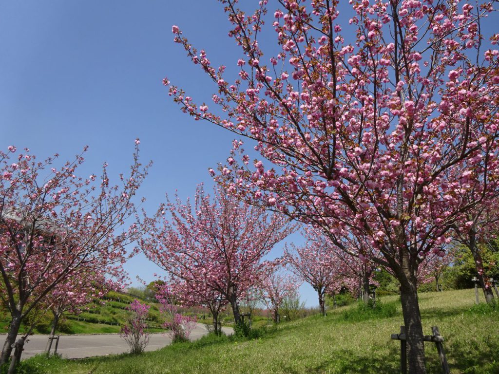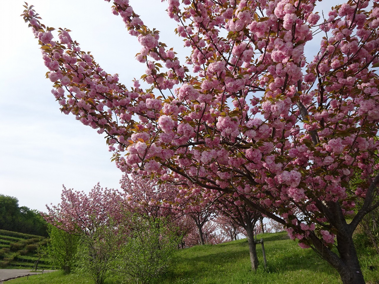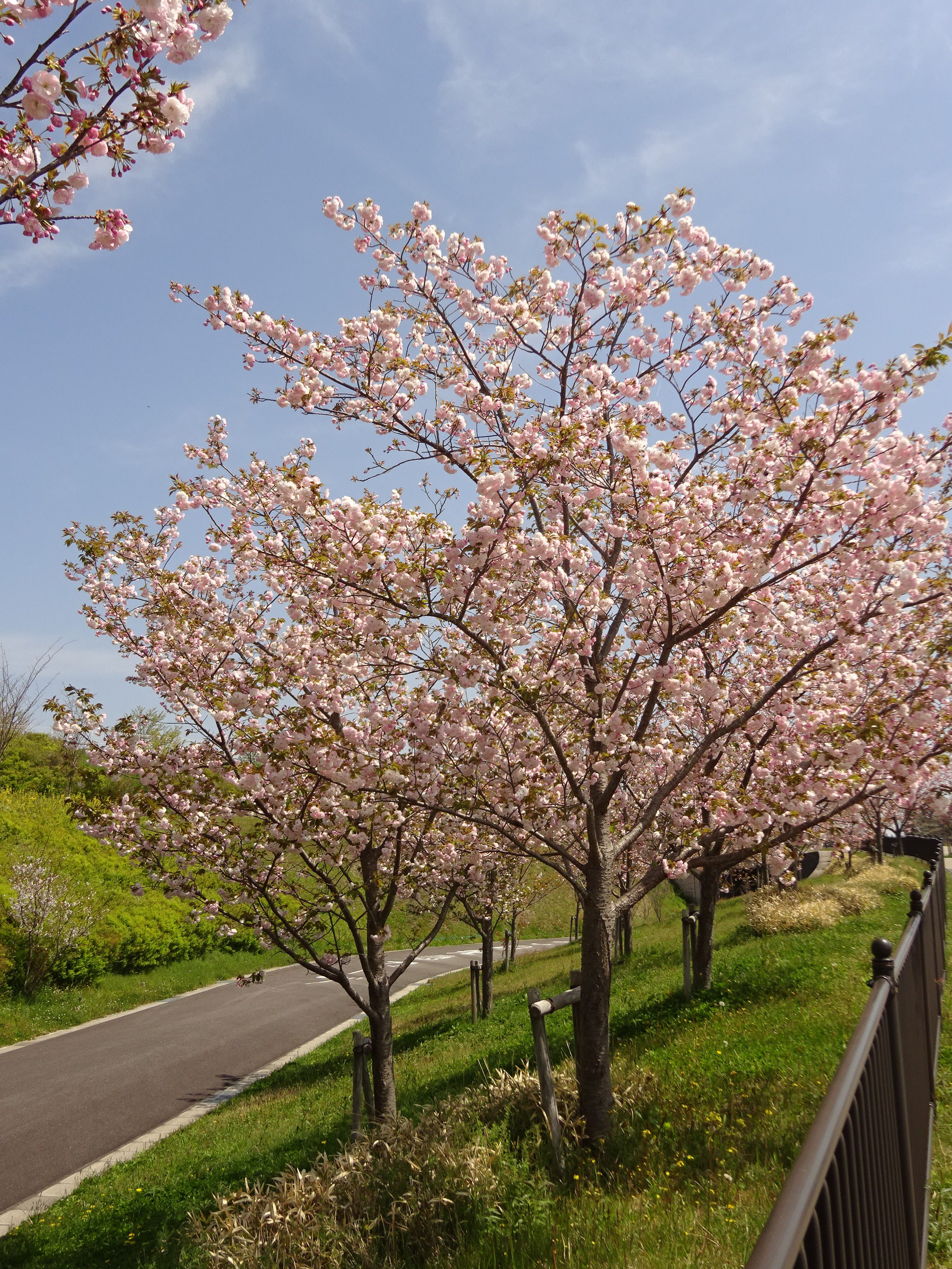 はなもも畑から西エントランス広場へ続く道沿いの斜面のサトザクラ、まだまだ見頃です。