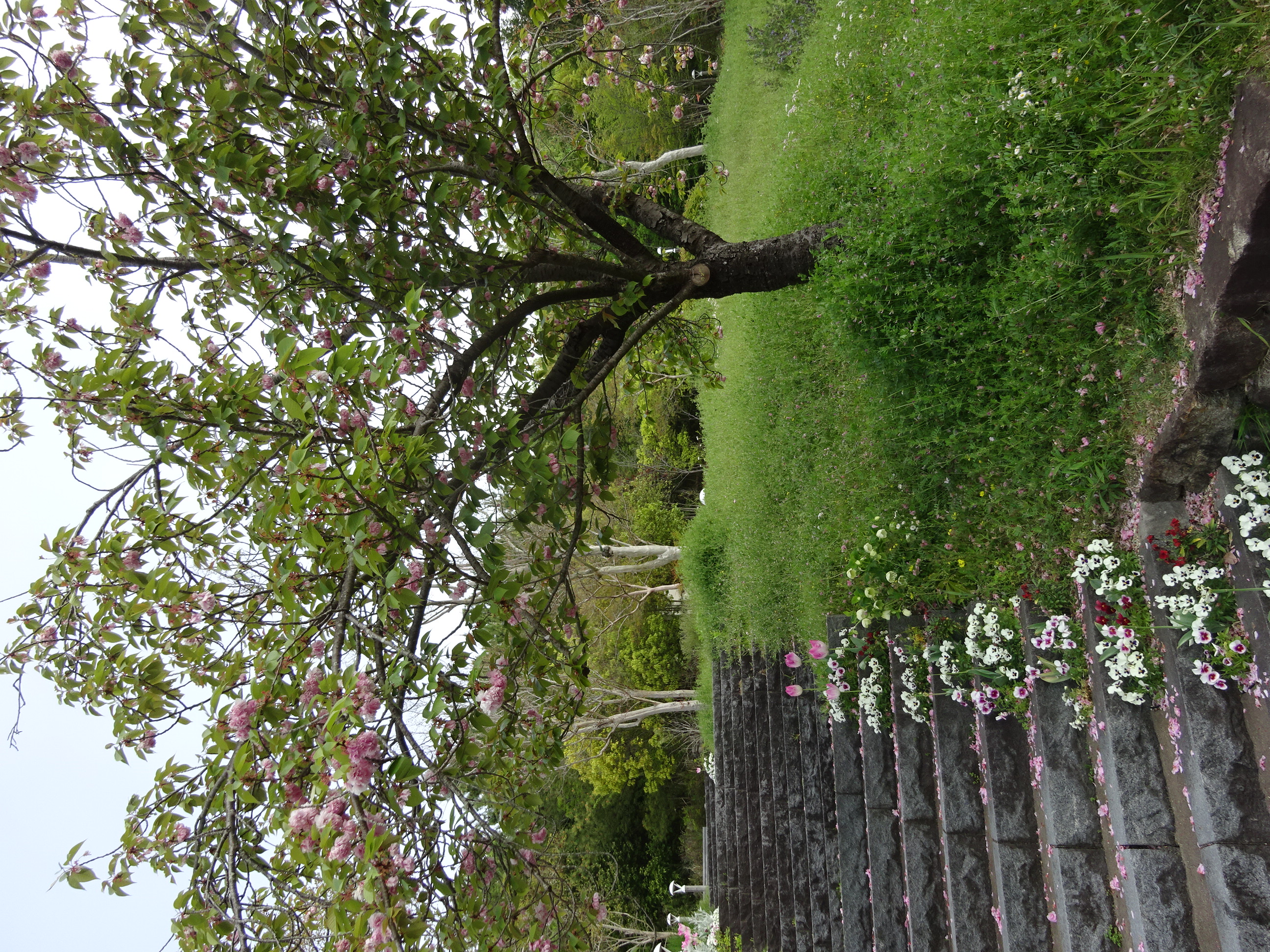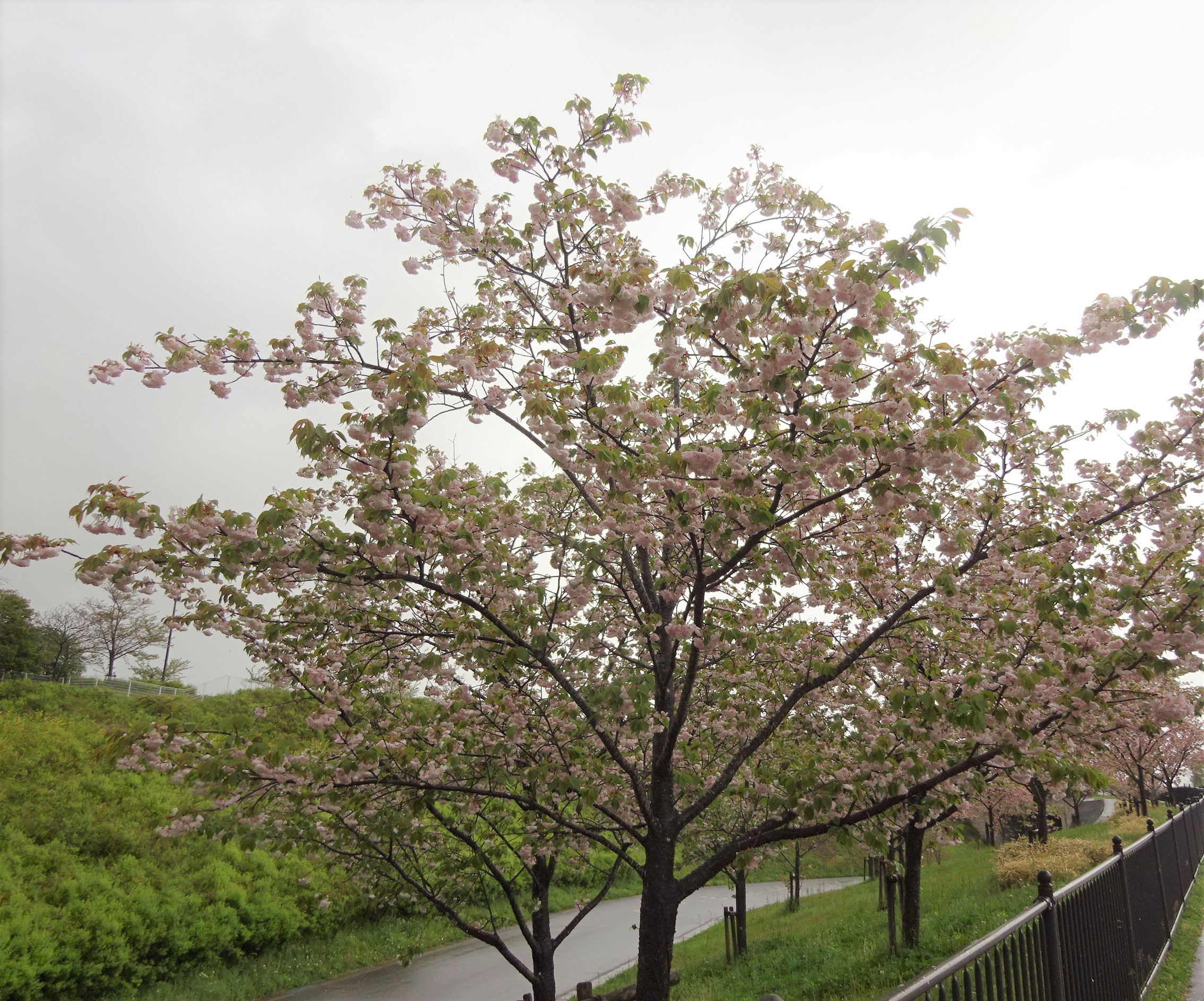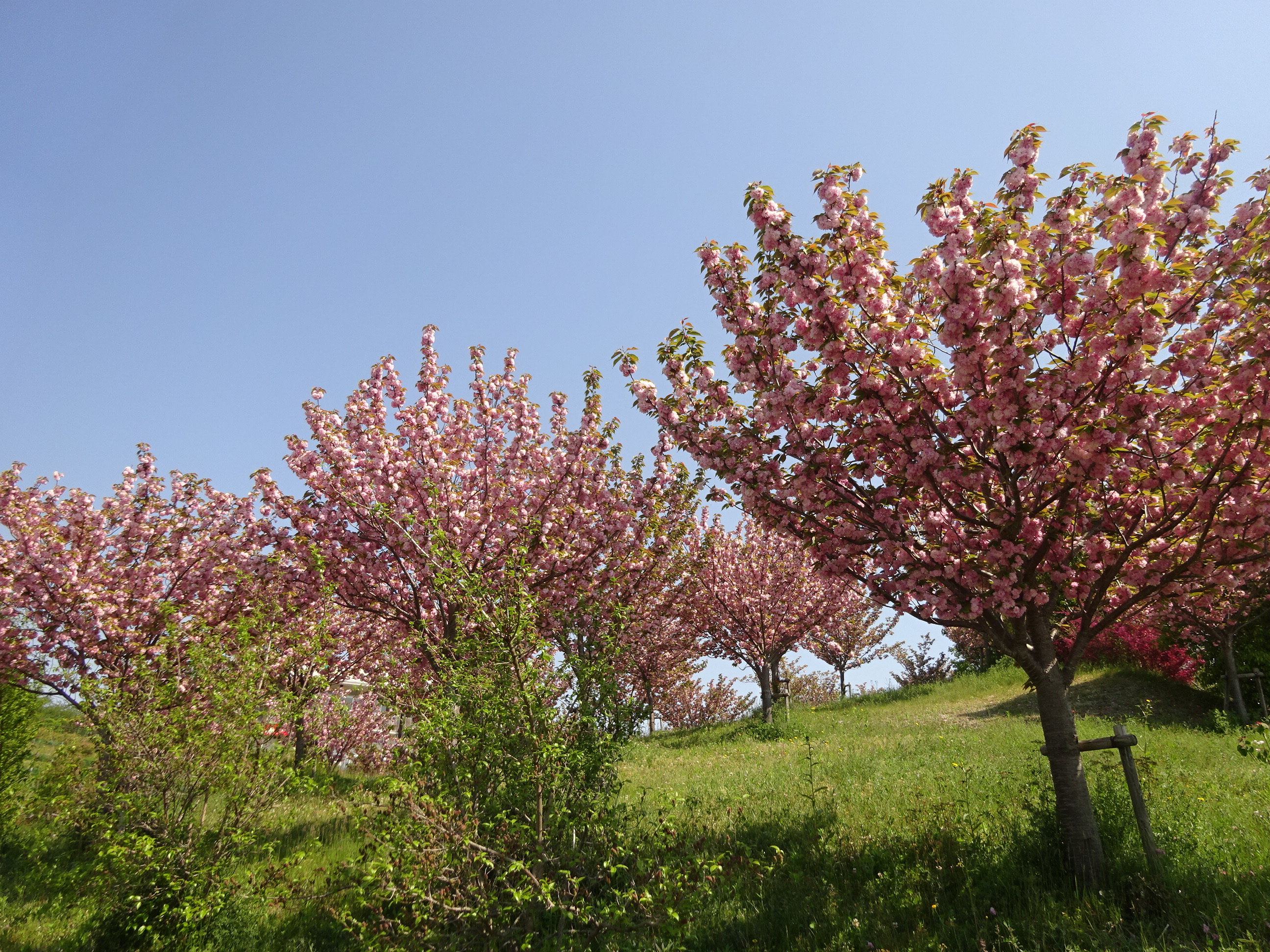 はなもも畑から西エントランス広場へ続く道沿いの斜面のサトザクラ、まだまだ見頃です。