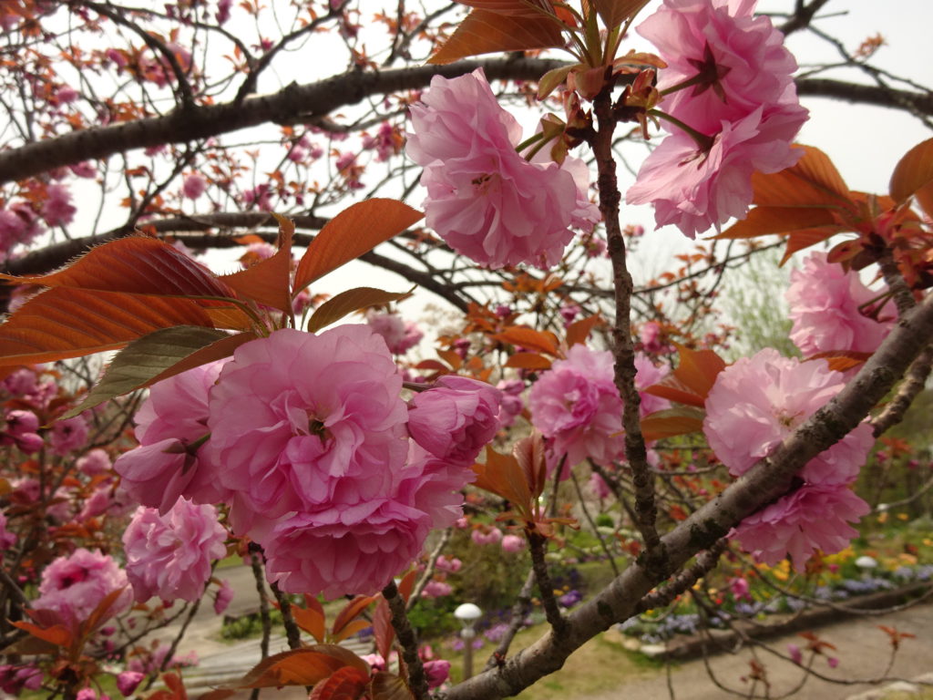 花の広場近くの園路沿いのサトザクラが咲き始めました。