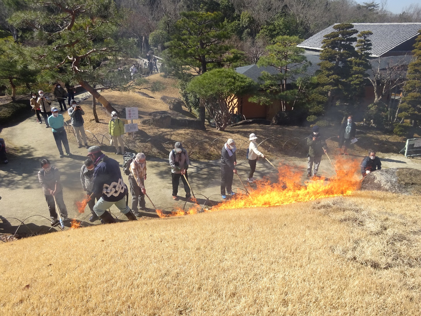 昨日、2/6に『日本庭園主亭』『かえで池池畔の径』で年に1度早春の風物詩『芝焼き』が行われました。