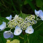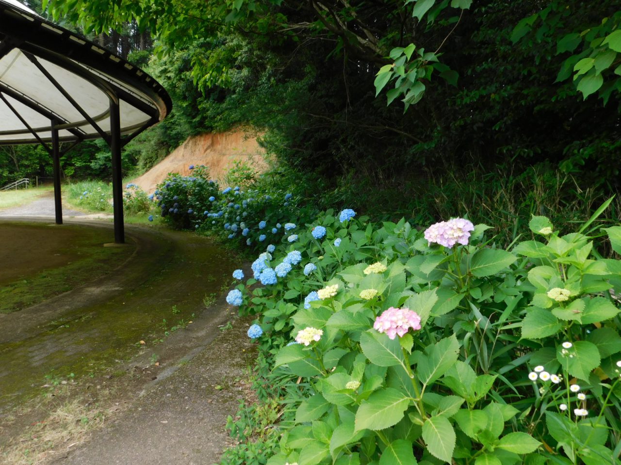 屋根付き広場の奥は様々な種類のアジサイが咲いています!