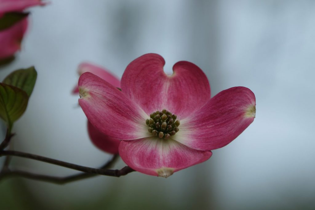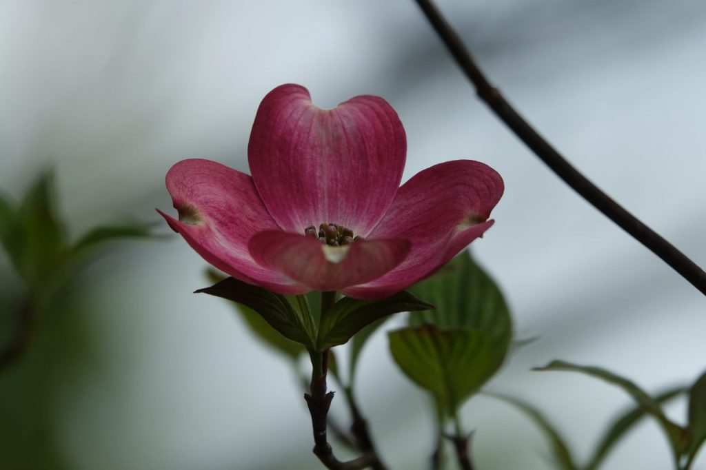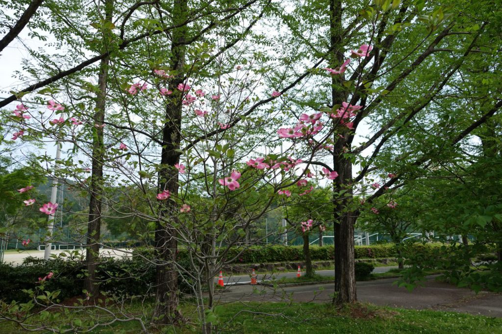 桜の季節が終わる頃、新緑の中で鮮やかな色の花を咲かせるハナミズキ