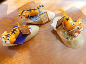 染色した繭を使って今年の干支トラさんを作りました。