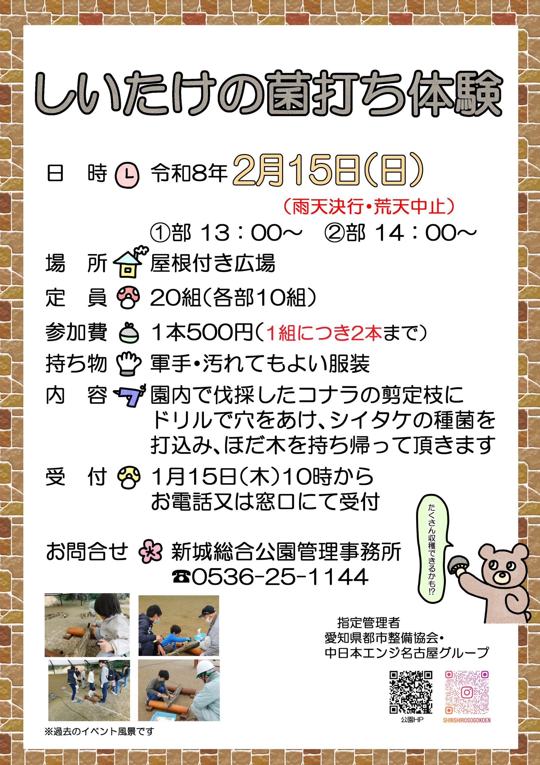 剪定枝に電動工具で穴をあけ、しいたけの駒菌を打ち込んでいただきます。