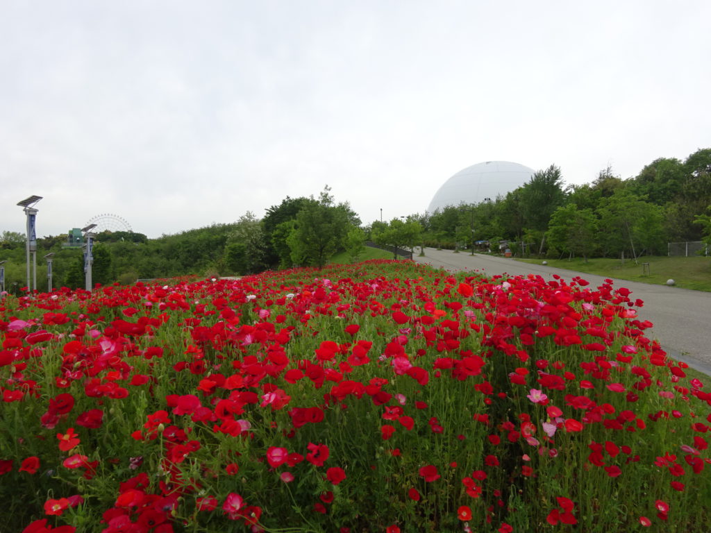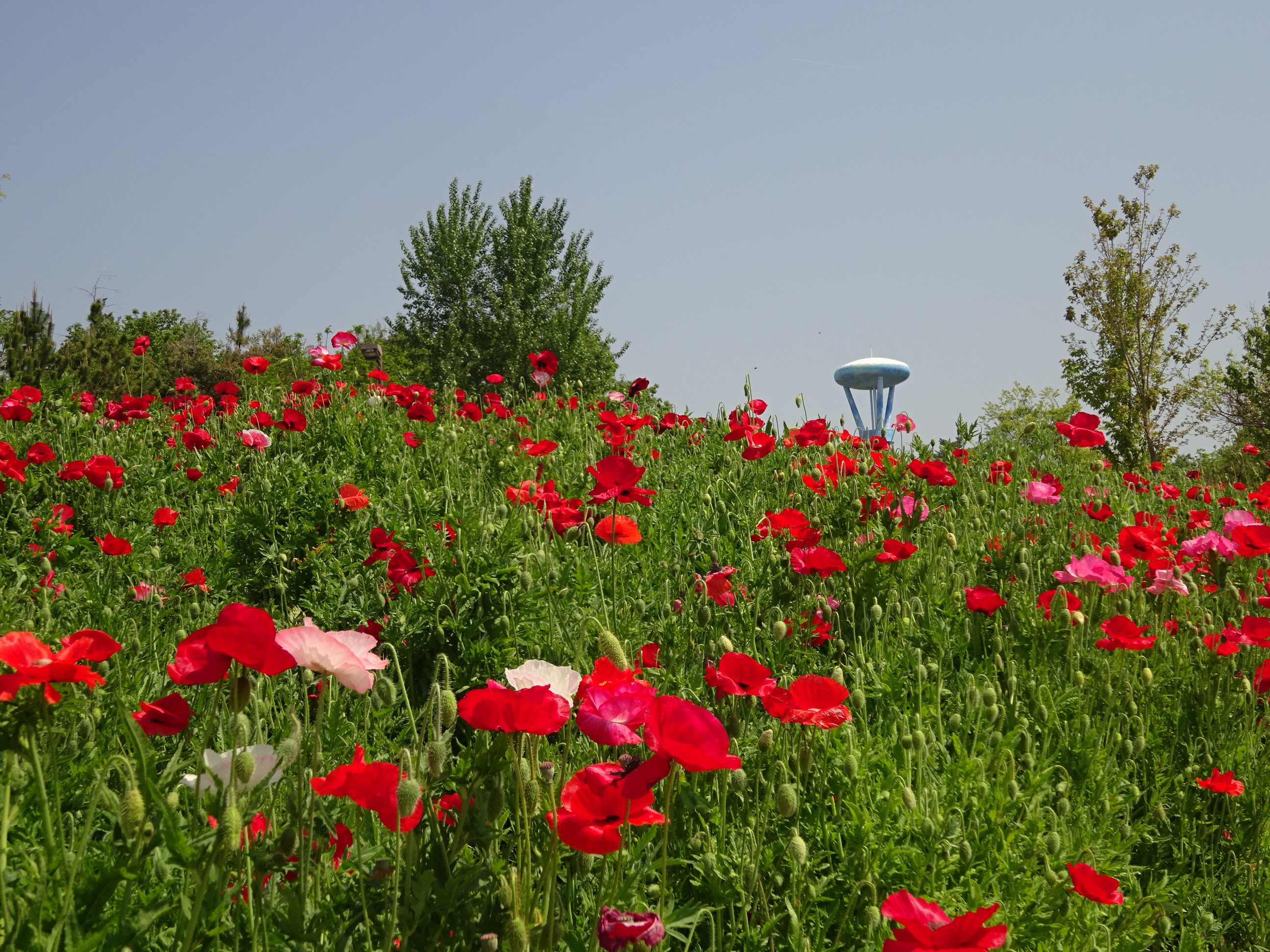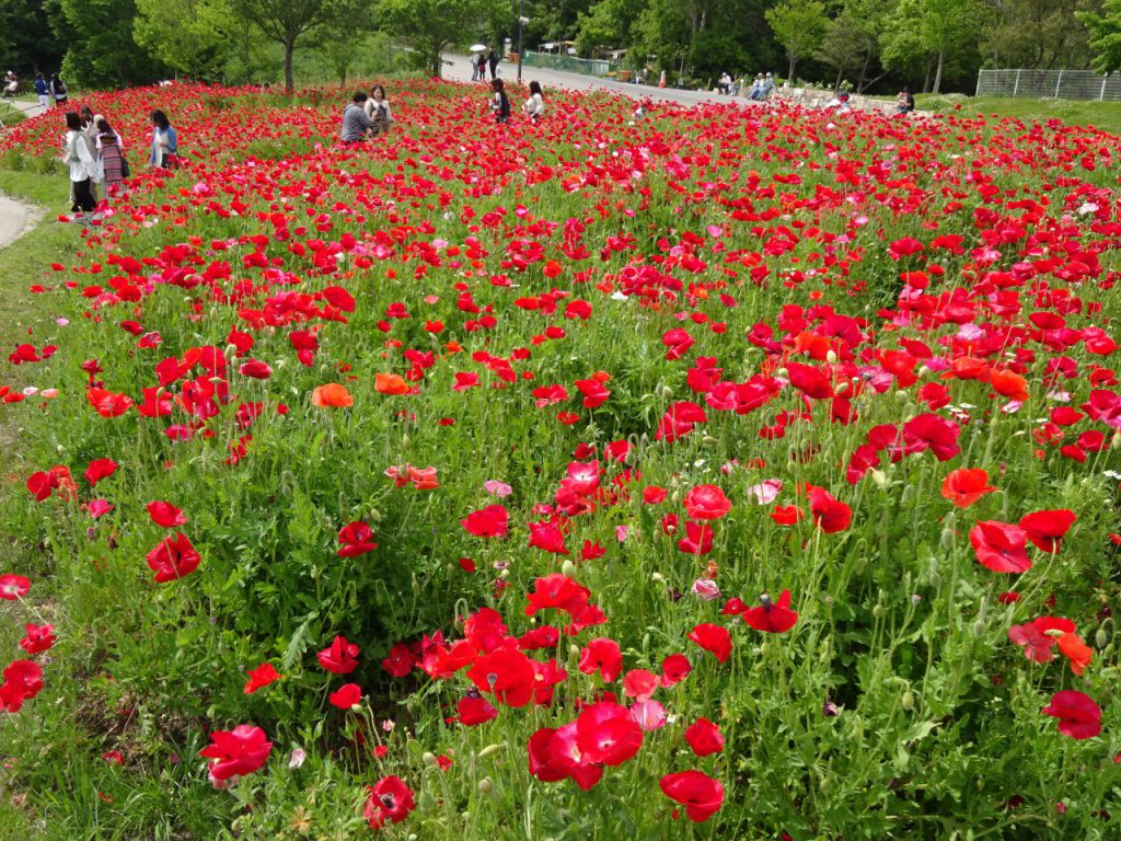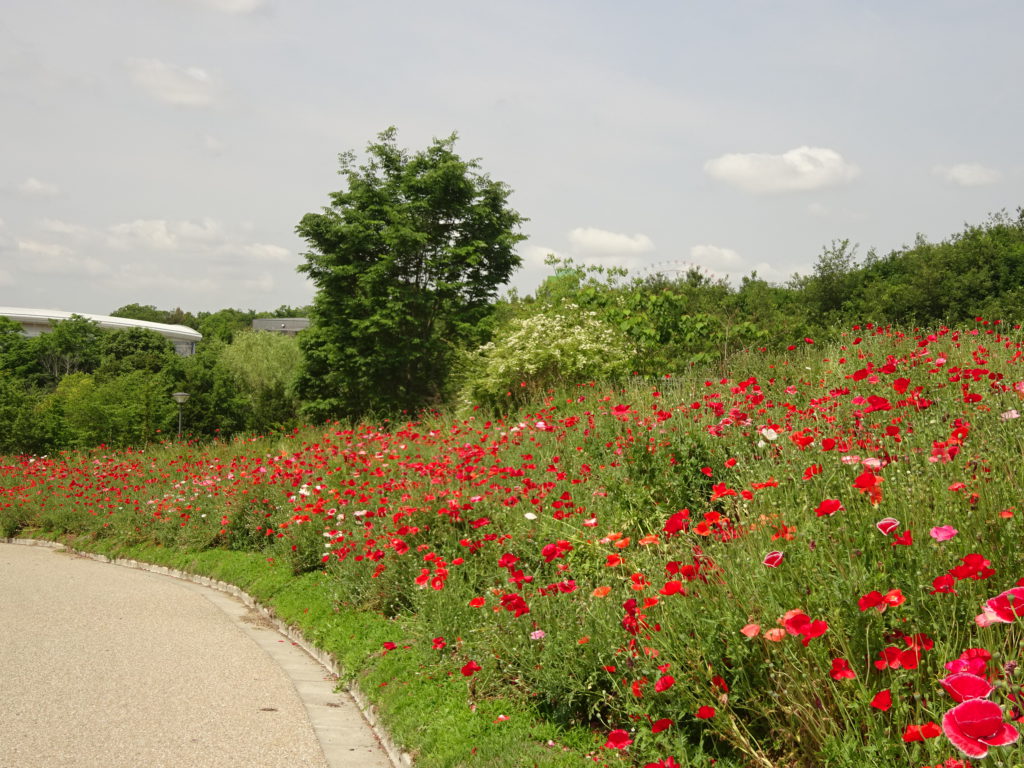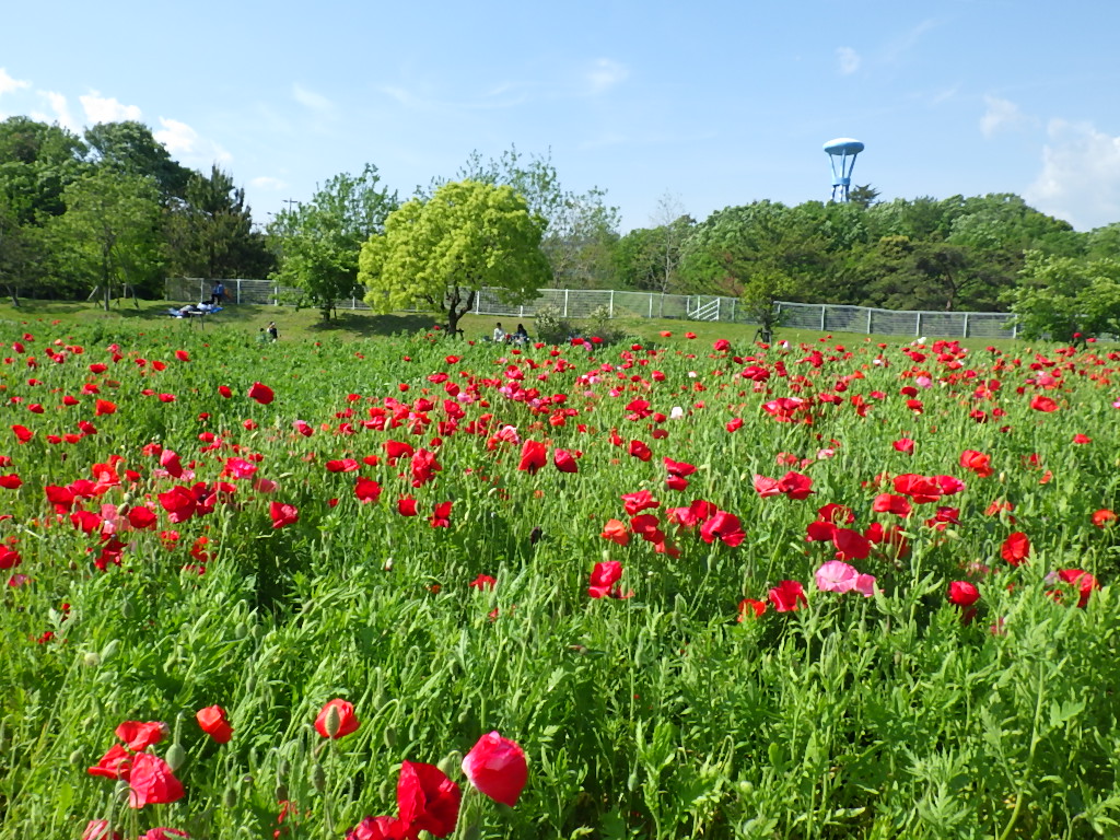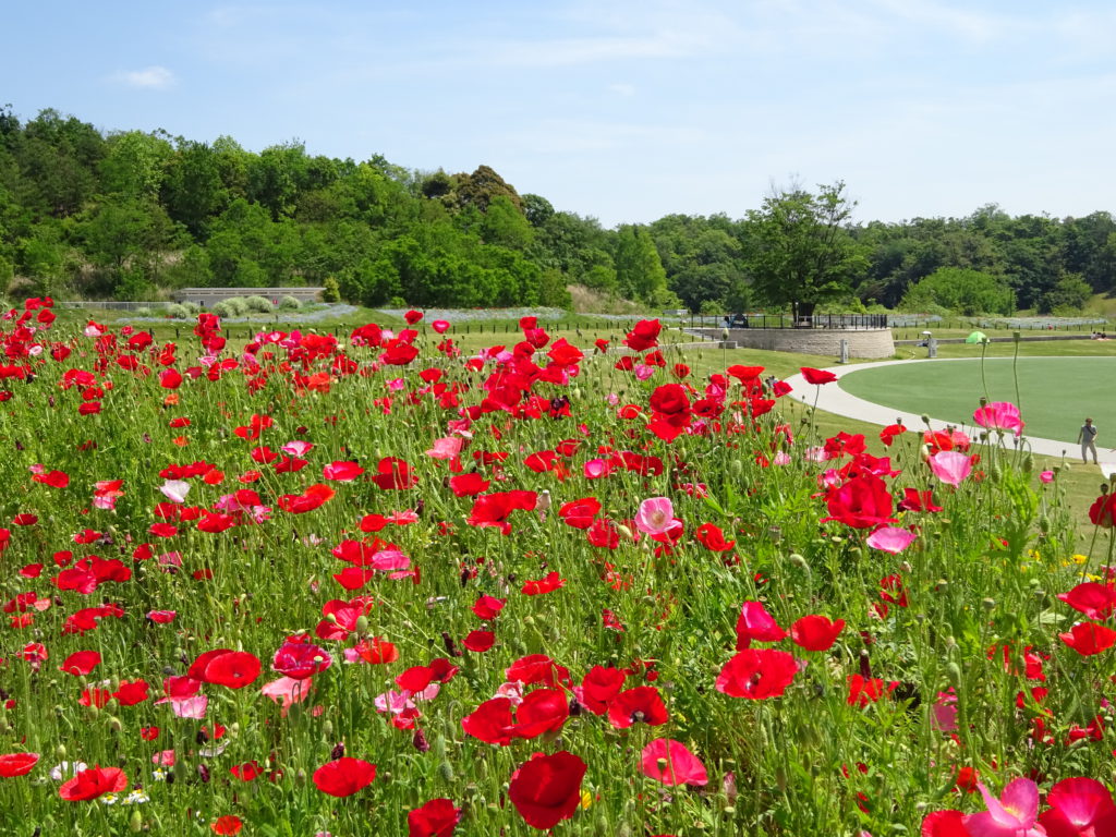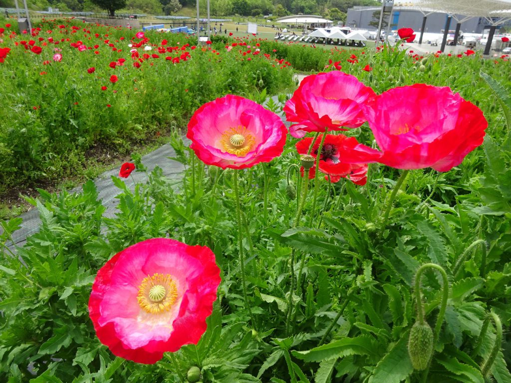 大芝生広場の「シャーレーポピー」、一面真っ赤な花で覆われていて、見ごたえがあります。