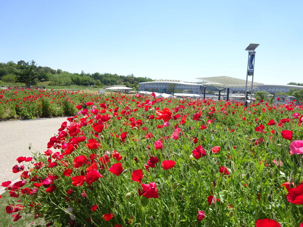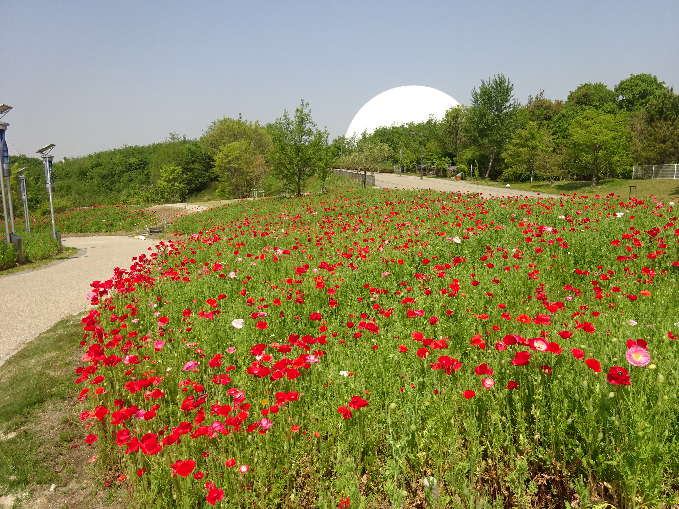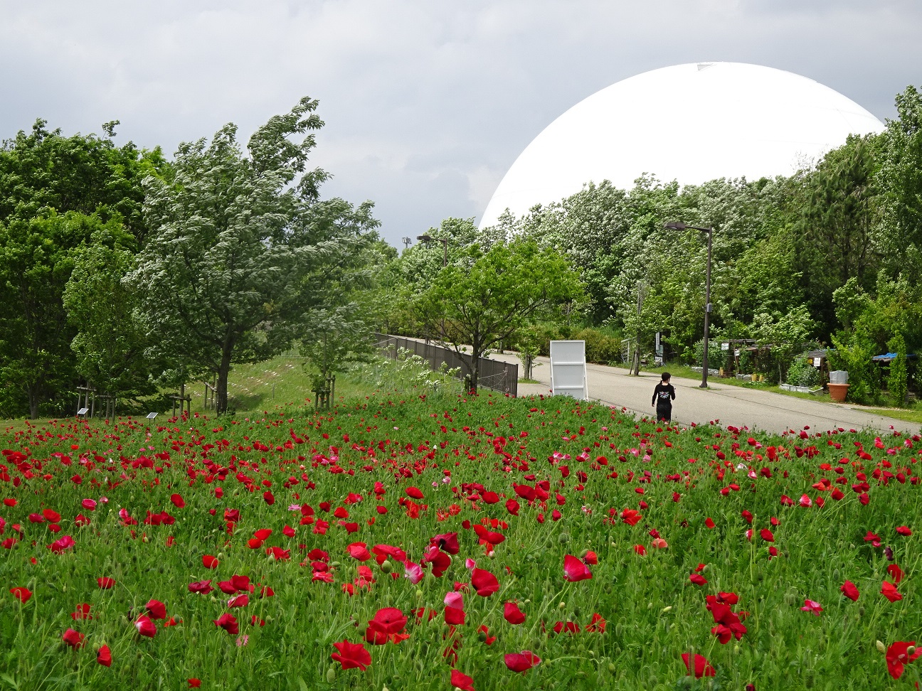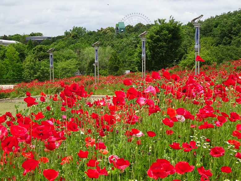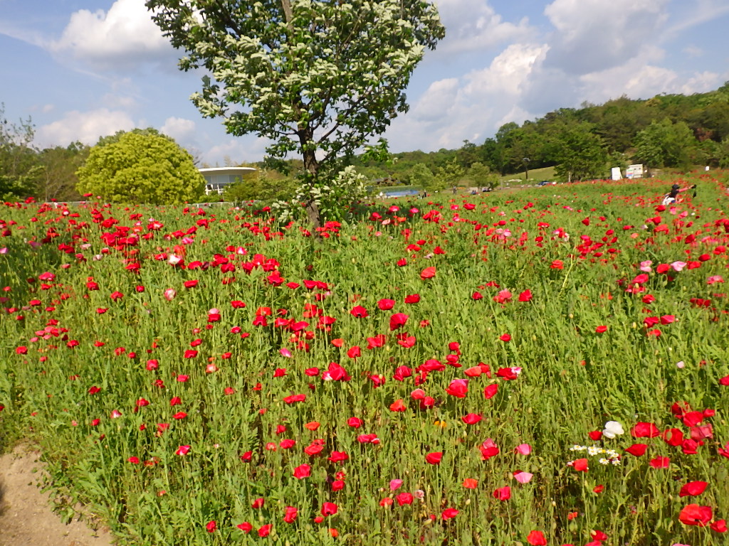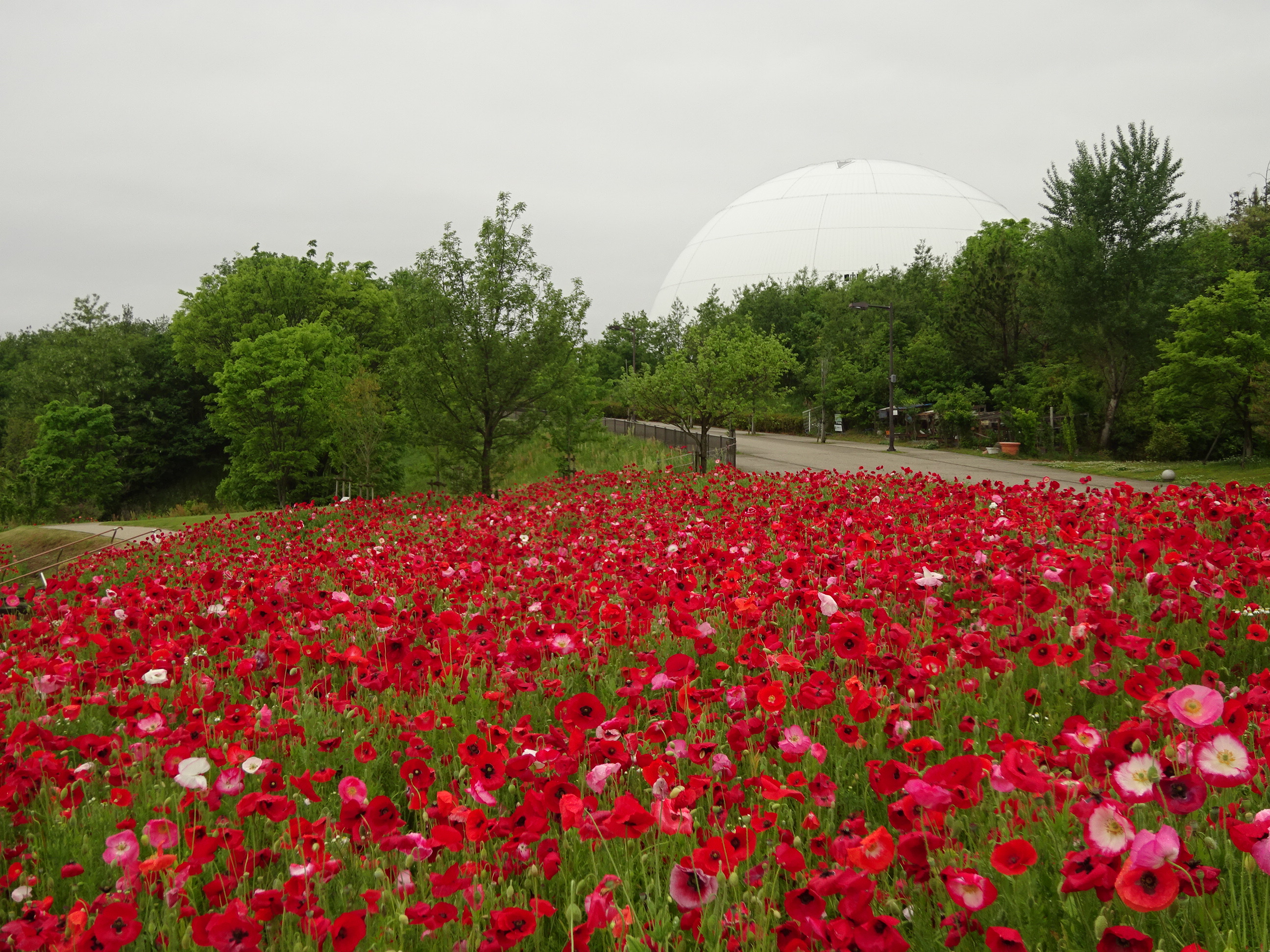 大芝生広場の「シャーレーポピー」、一面真っ赤な花で覆われていて、見ごたえがあります。