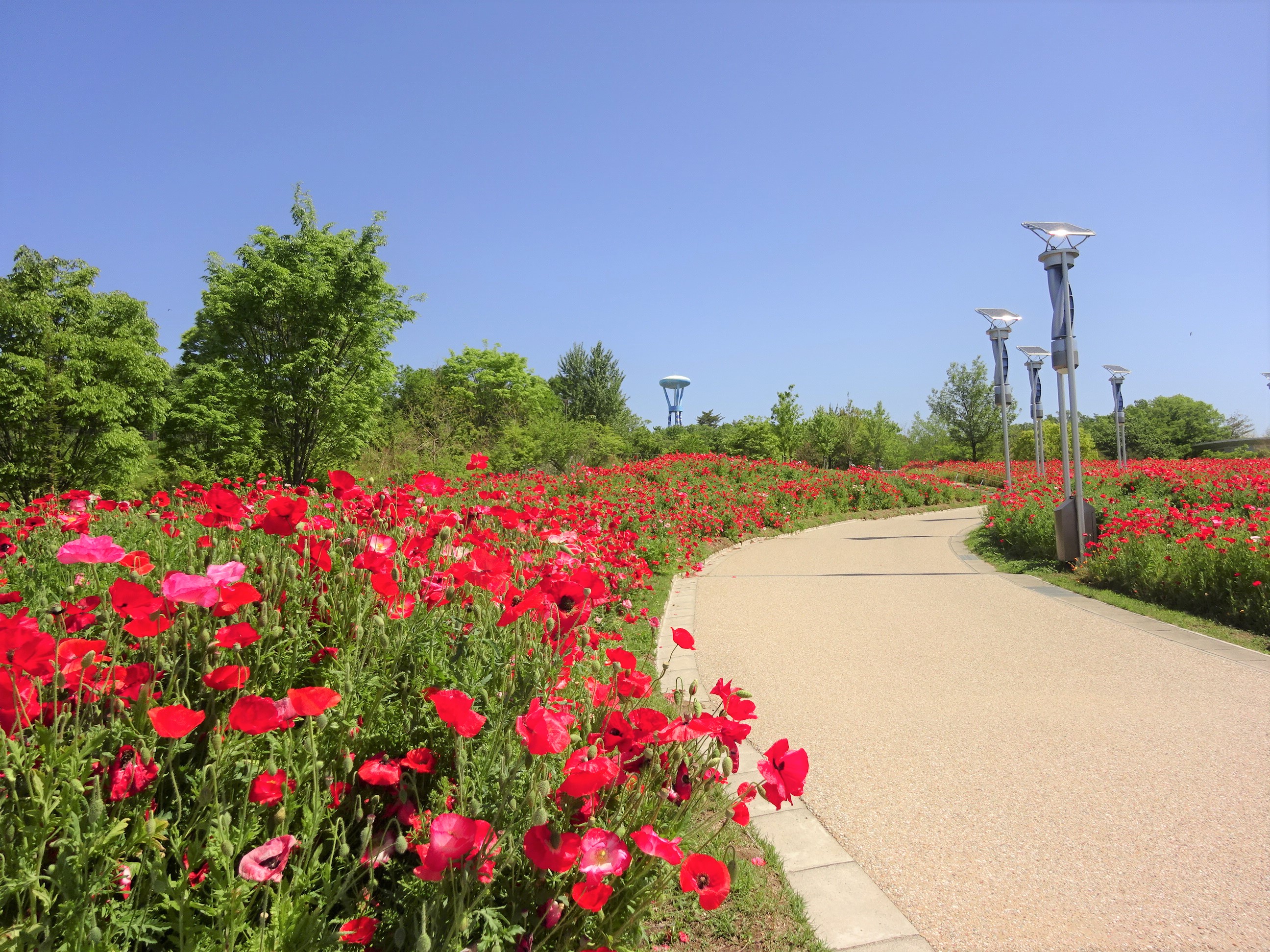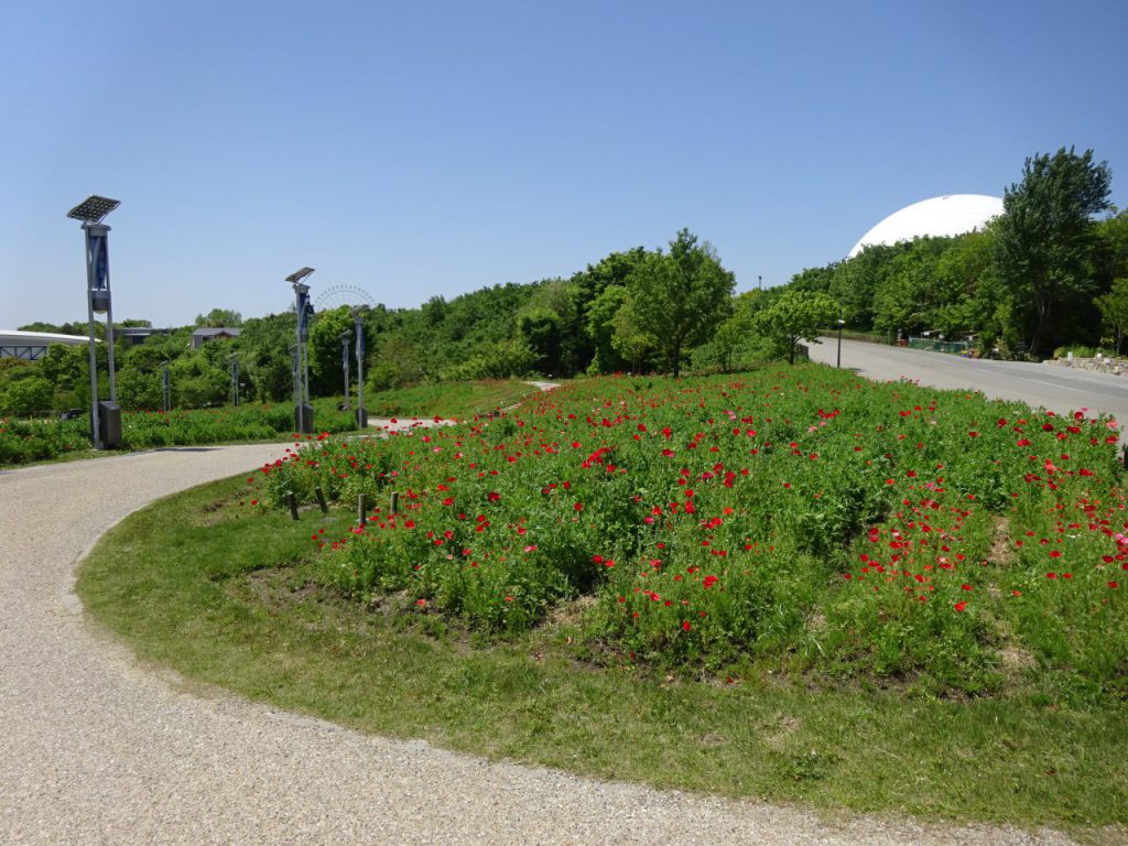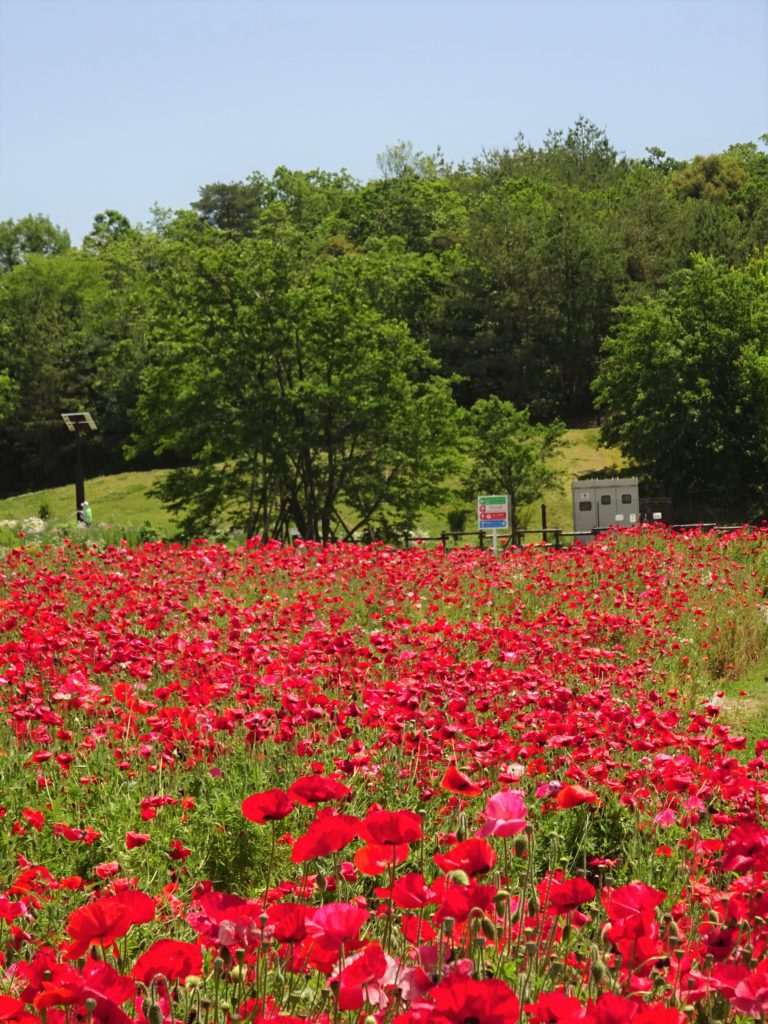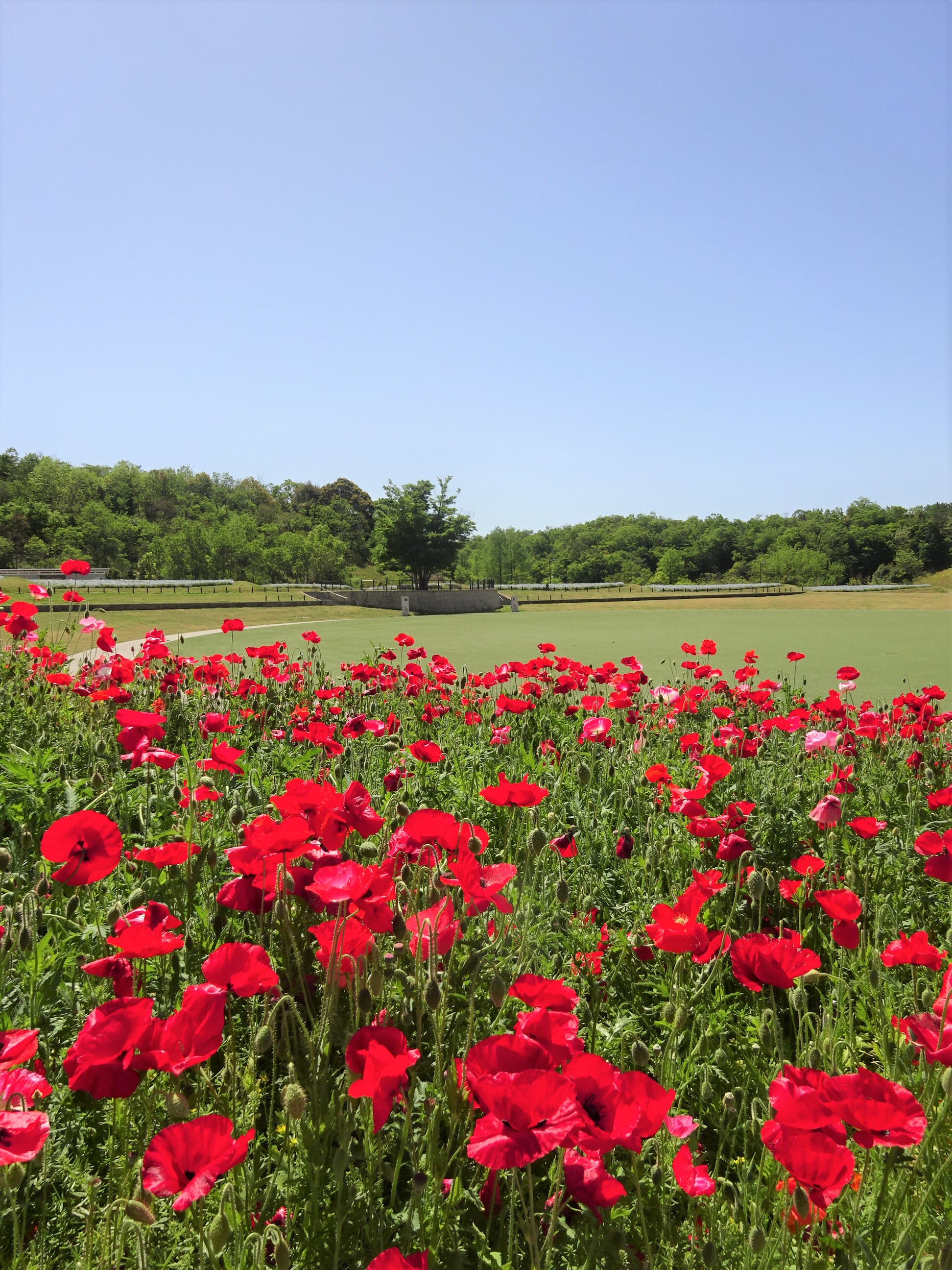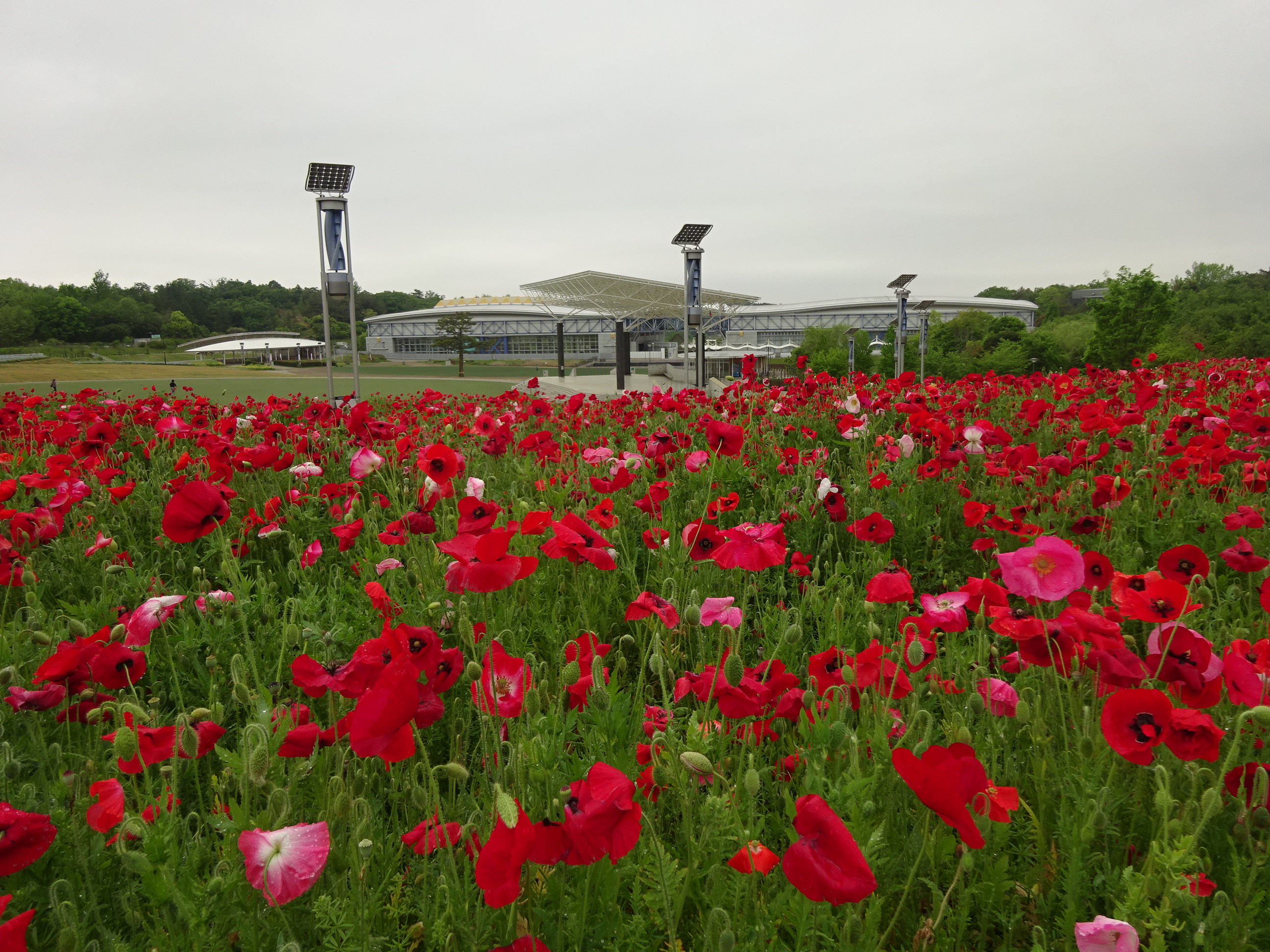 大芝生広場の「シャーレーポピー」、一面真っ赤な花で覆われていて、見ごたえがあります。