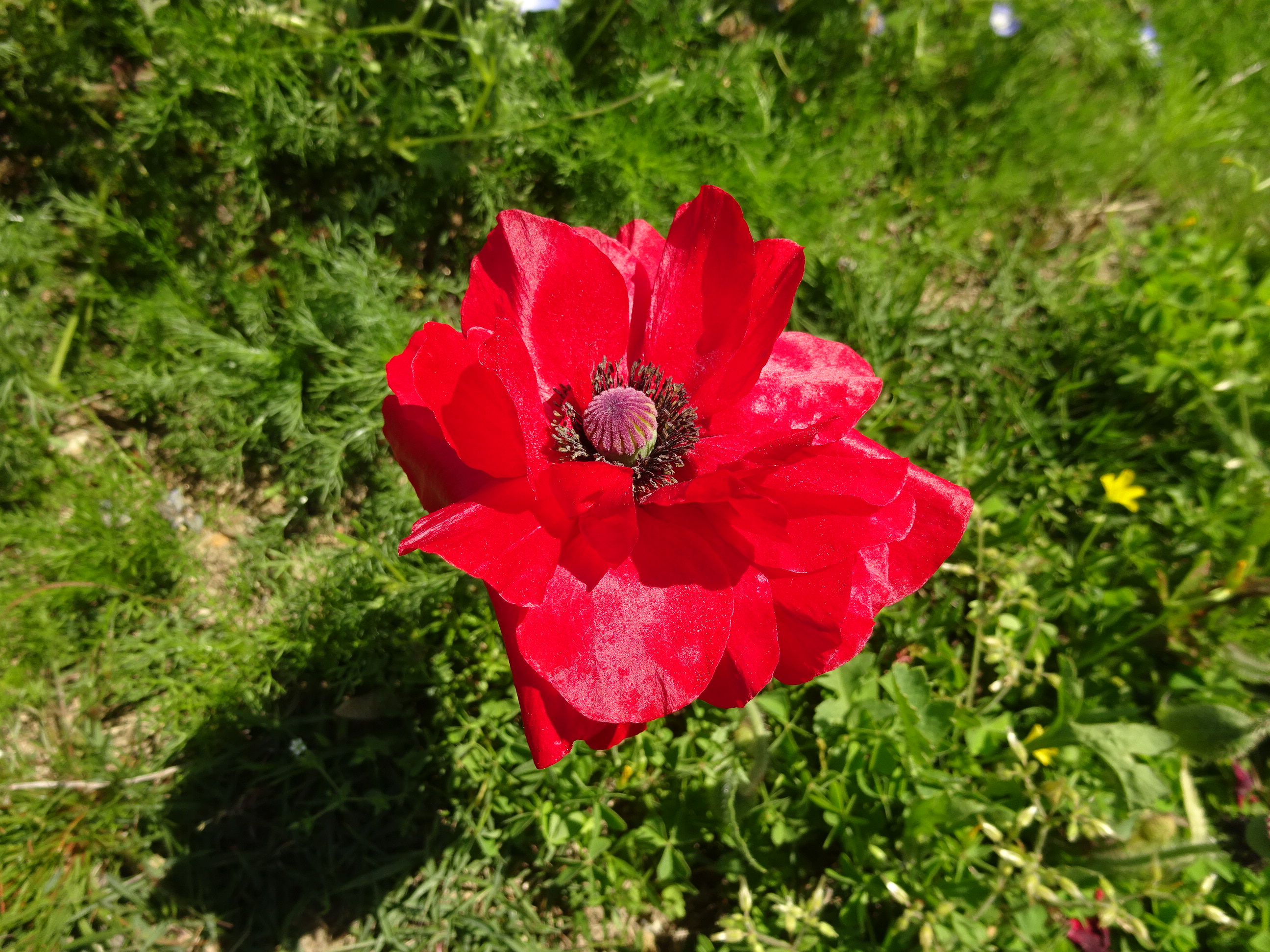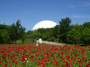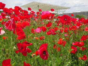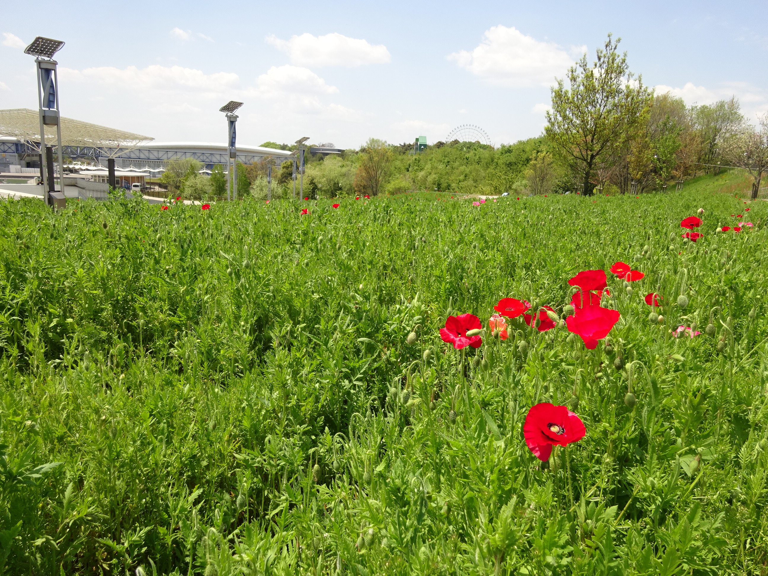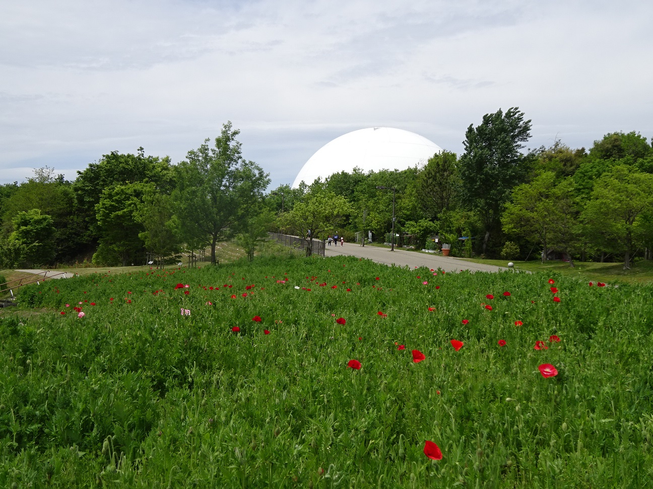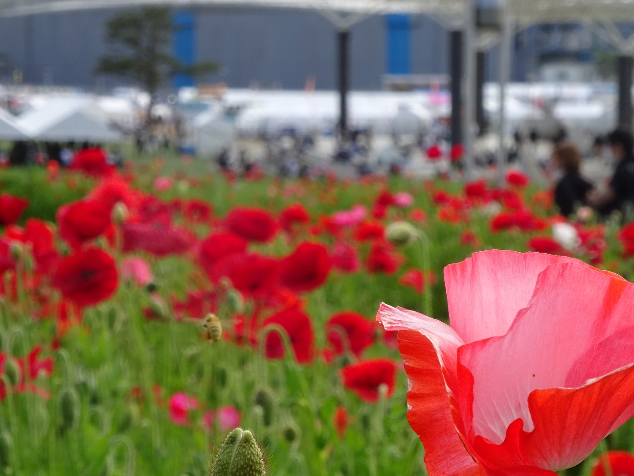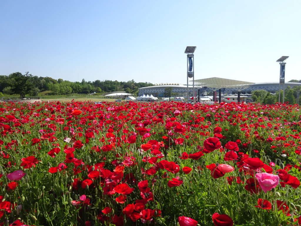 大芝生広場の「シャーレーポピー」、一面真っ赤な花で覆われていて、見ごたえがあります。