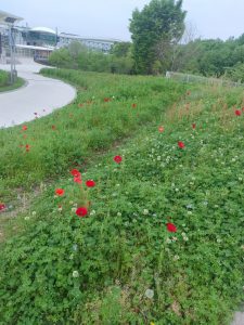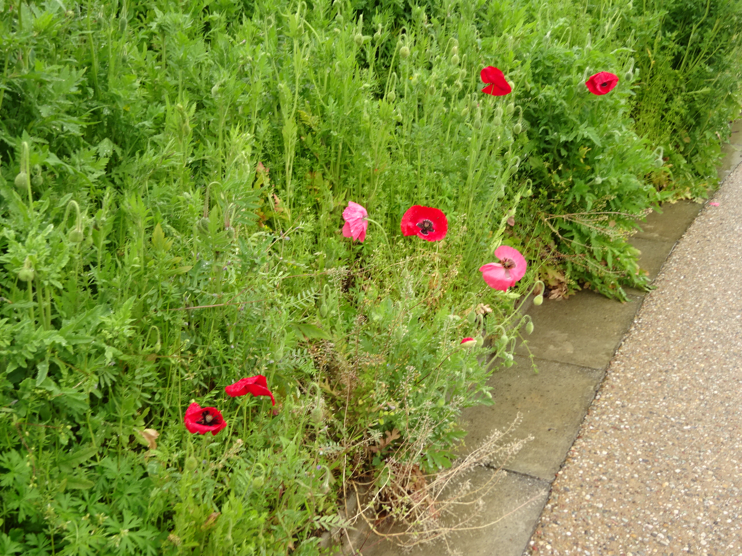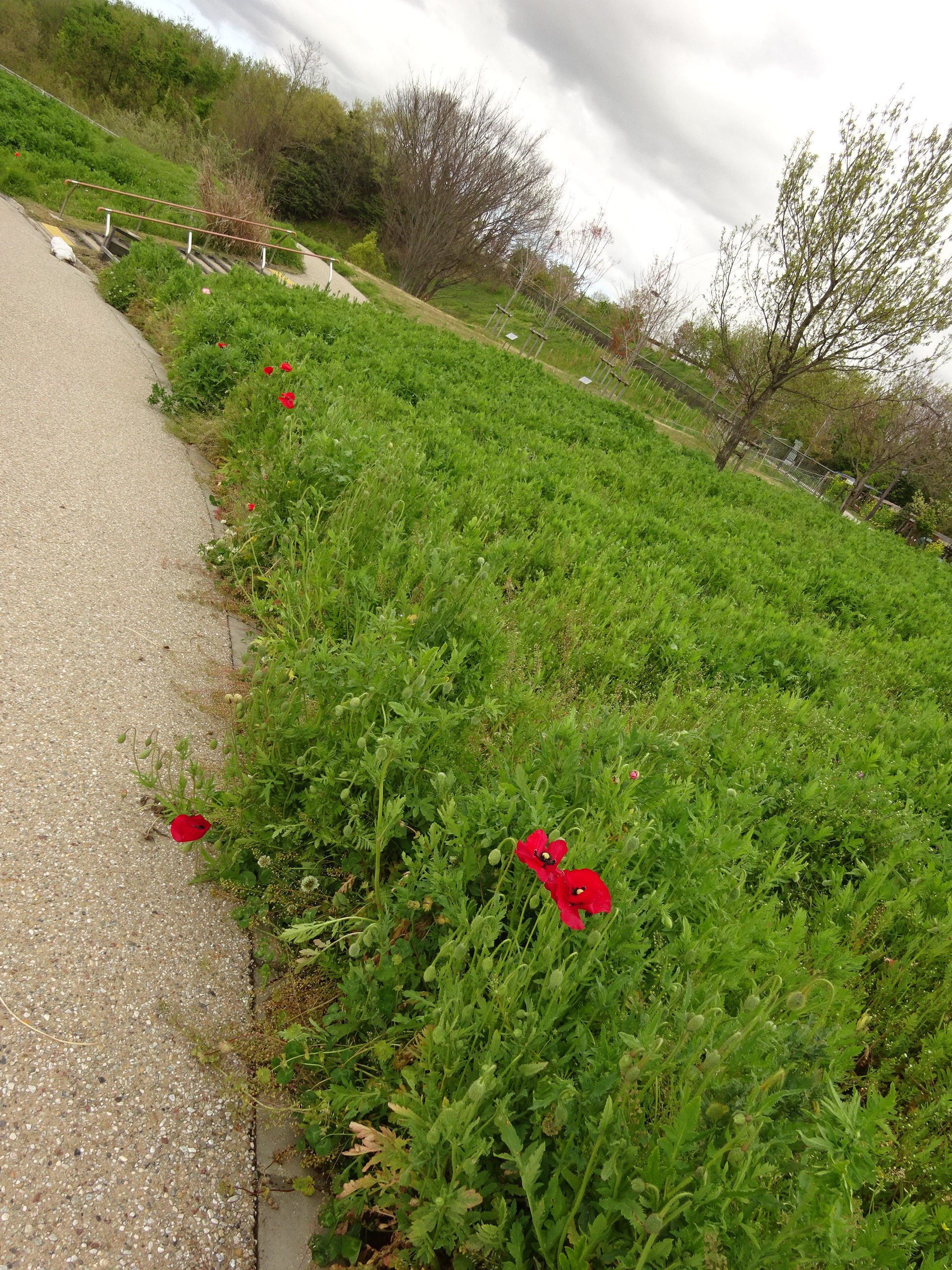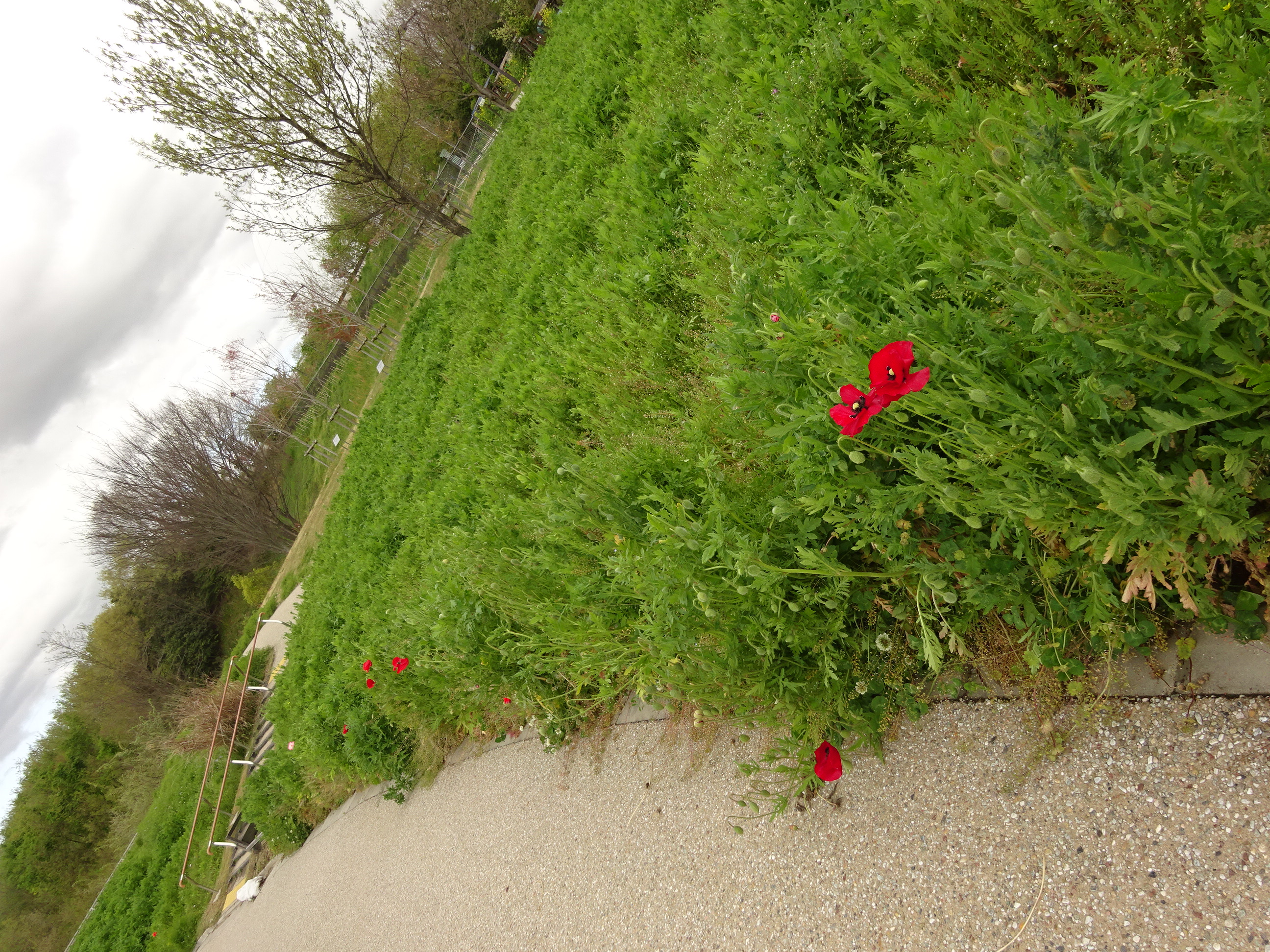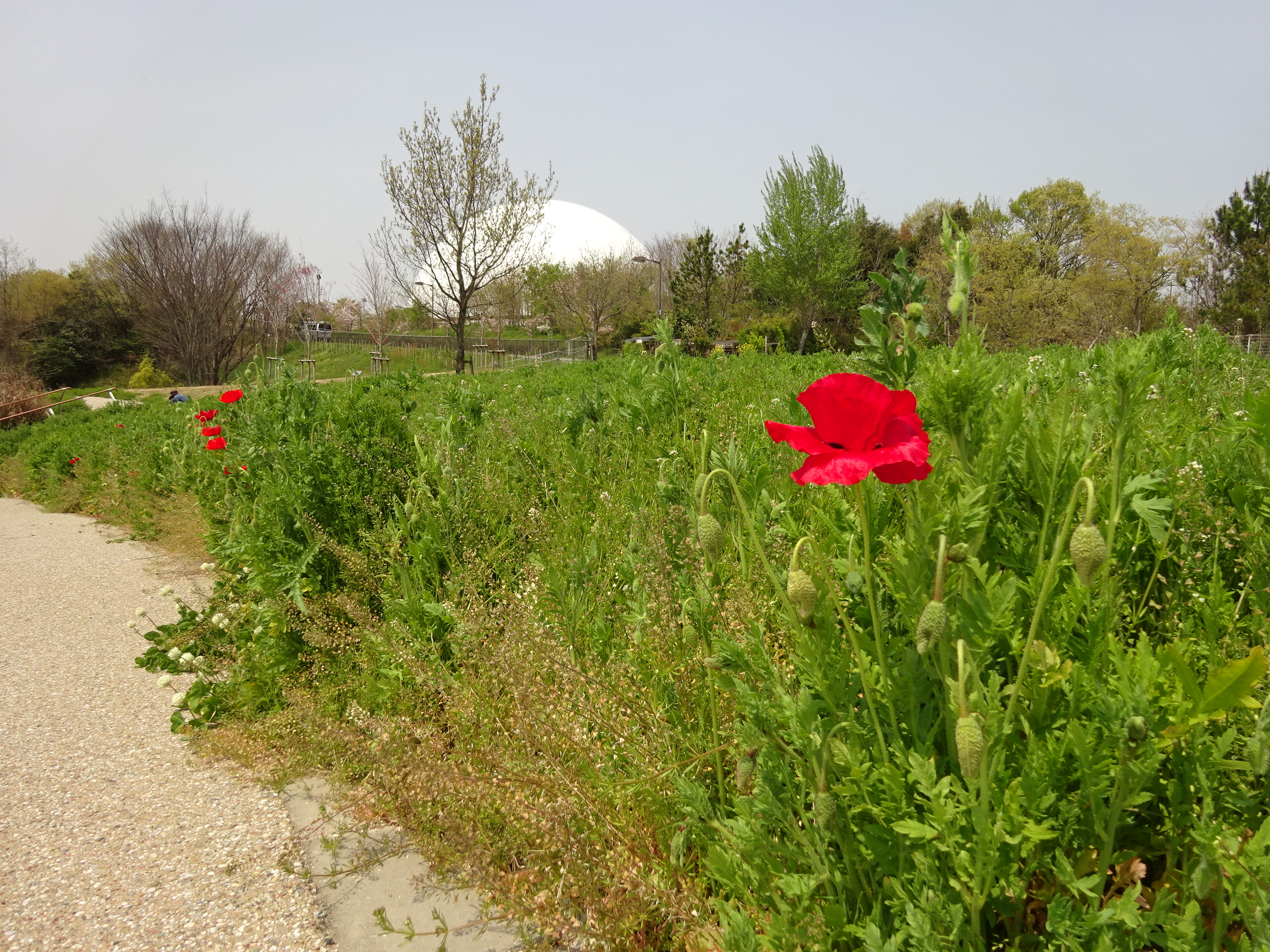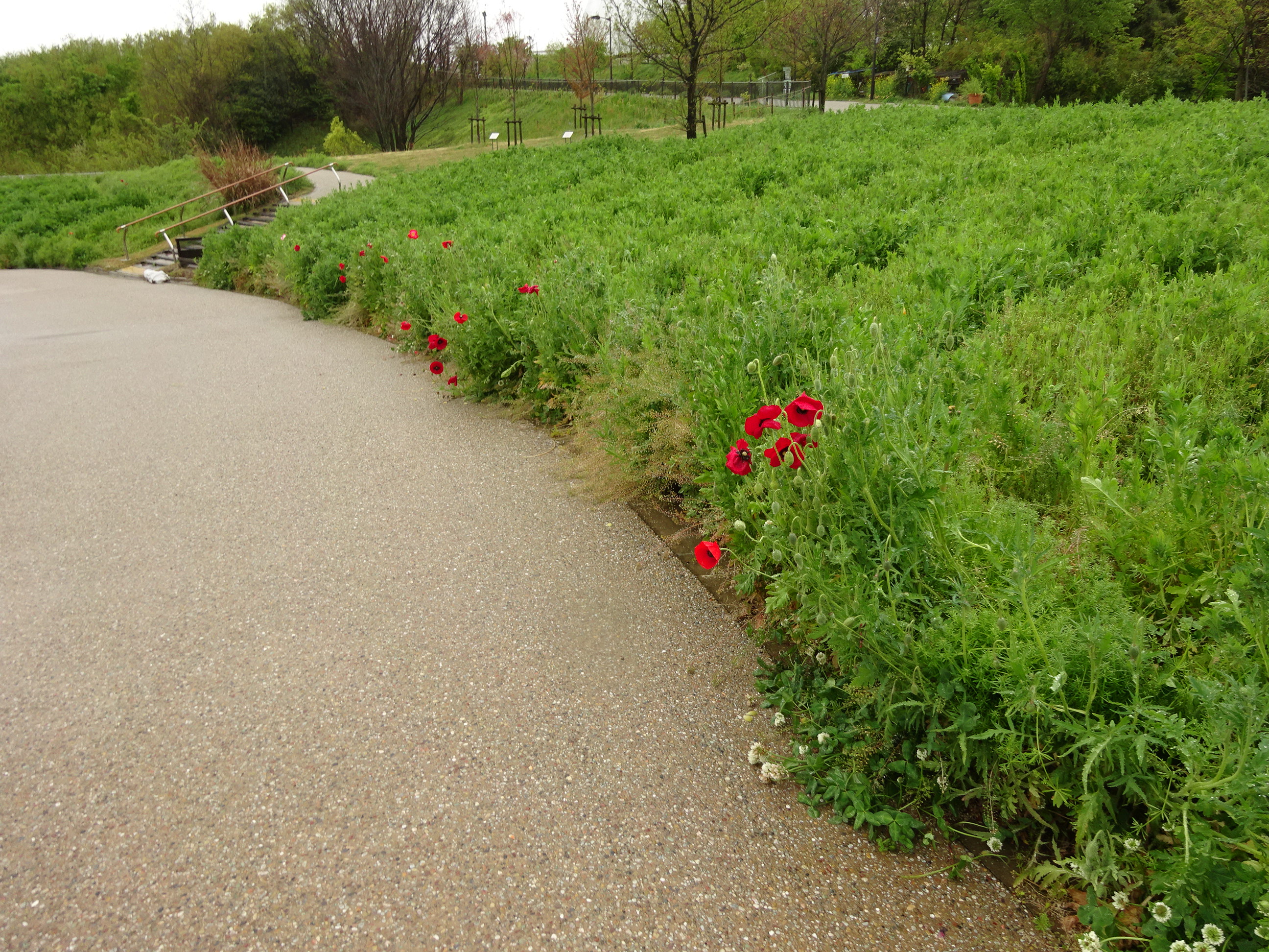 大芝生広場の東側。花の小道を挟んで、ポピーがかなり咲いてきました。