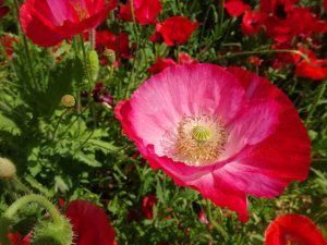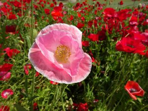 お花畑のシャーレポピーは赤色だけではなくピンク色のものも咲きます。