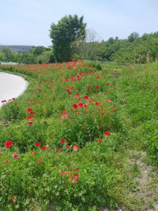 モリコロパーク、春のお花の代表格、お花畑のシャーレーポピーが咲き始めました。