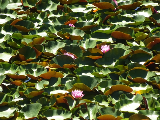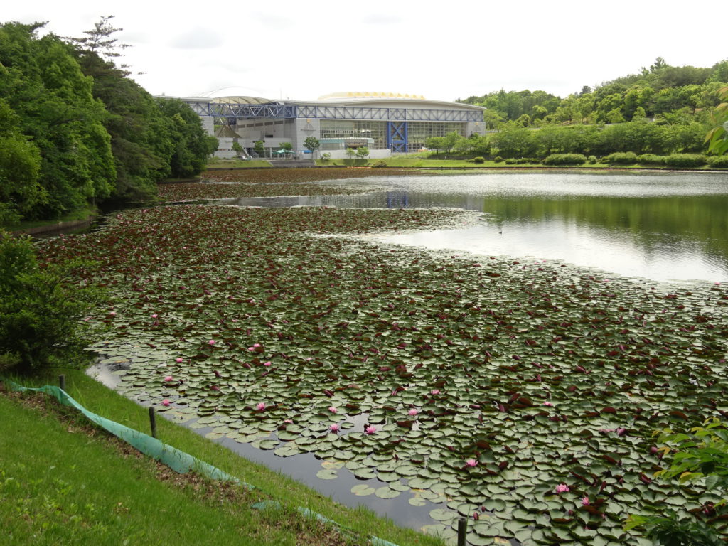 青春の丘エリアの南側、はす池の「スイレン」がたくさんの花を付けています。