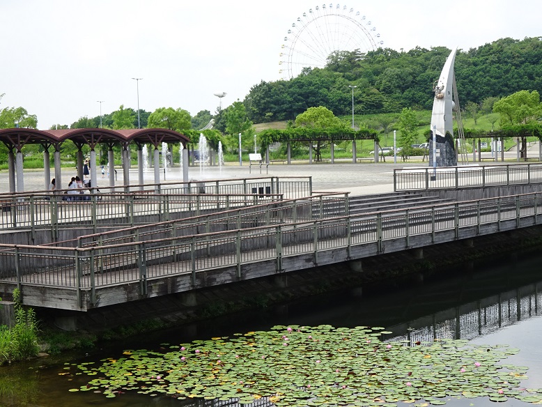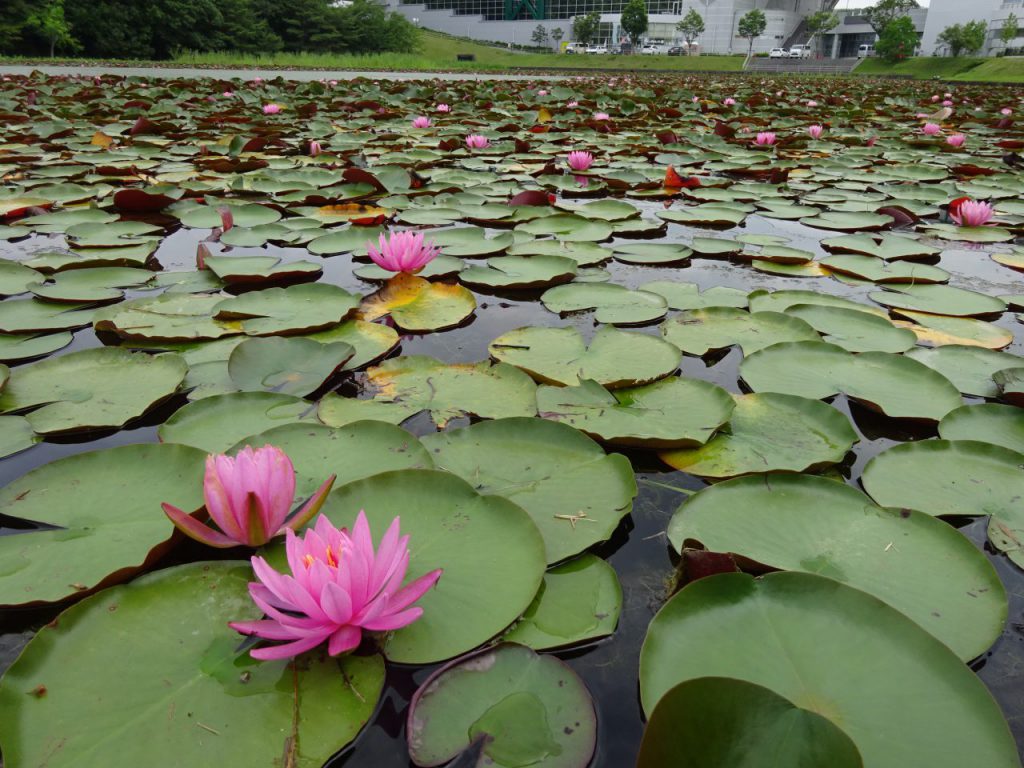 西エントランス広場とプールスケート場の間の「こいの池」でピンク色のスイレンがたくさん咲きました。