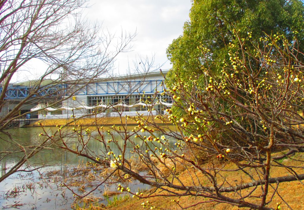 大芝生広場横のはす池の脇にあるウメの並木が見頃を迎えました。