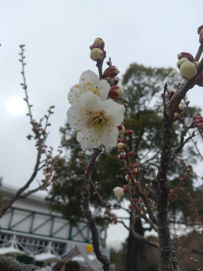 アイススケート場近くにあるウメ、見頃にはまだまだですが、ちらほらと咲き始めていますよ。
