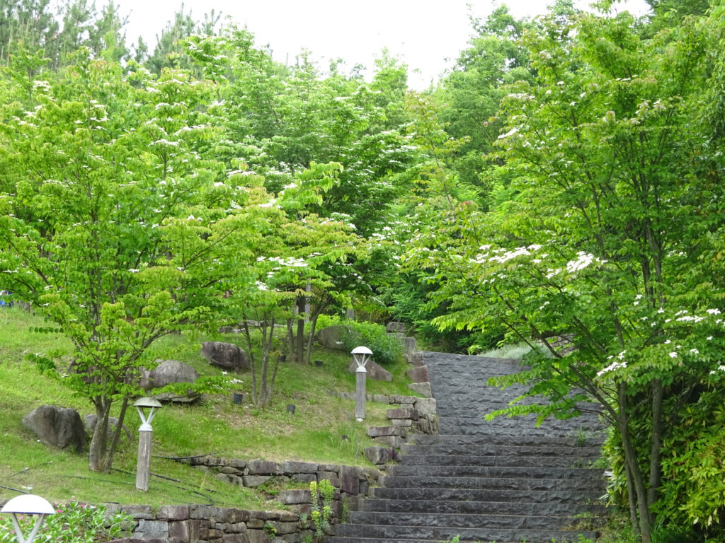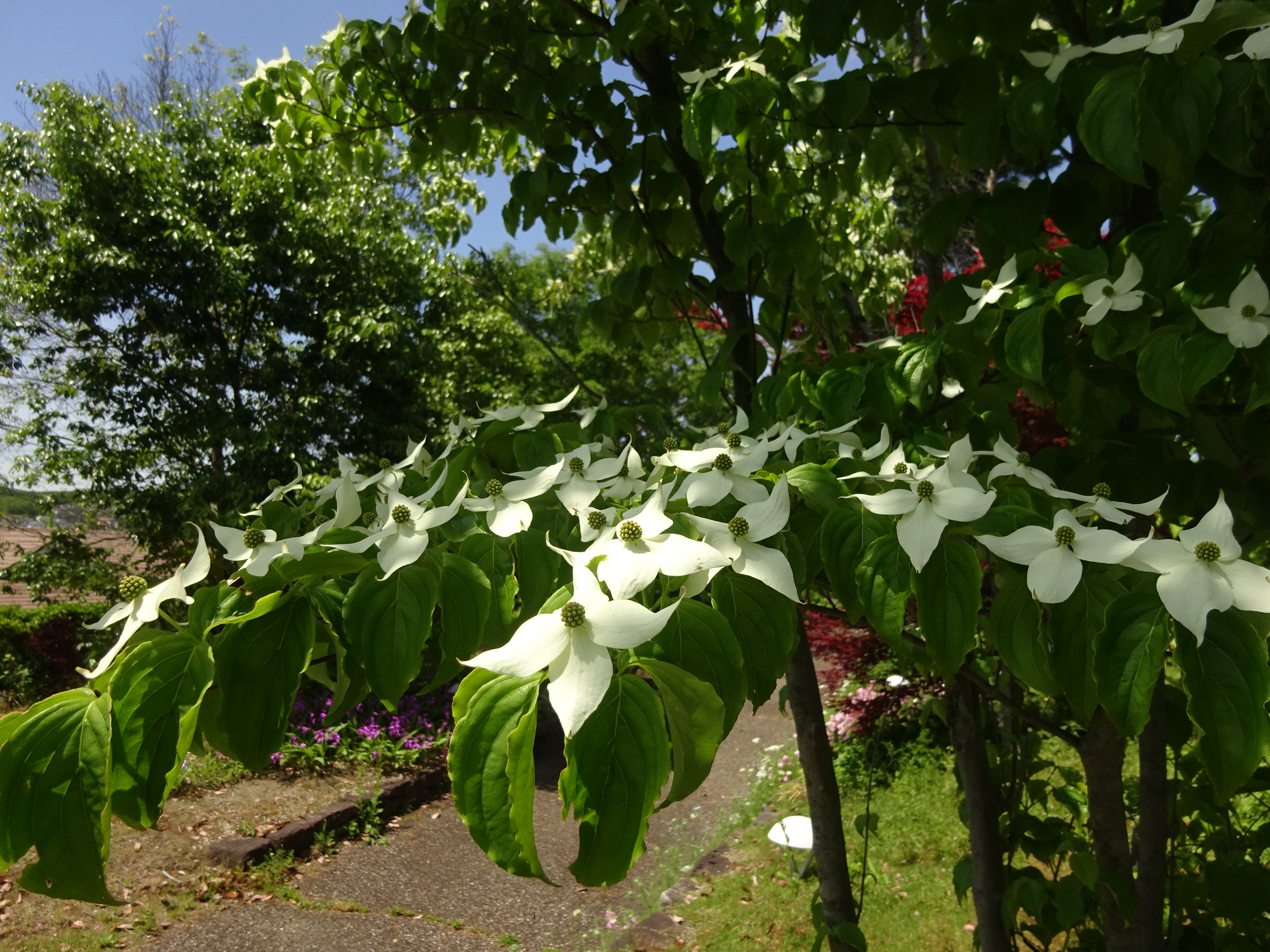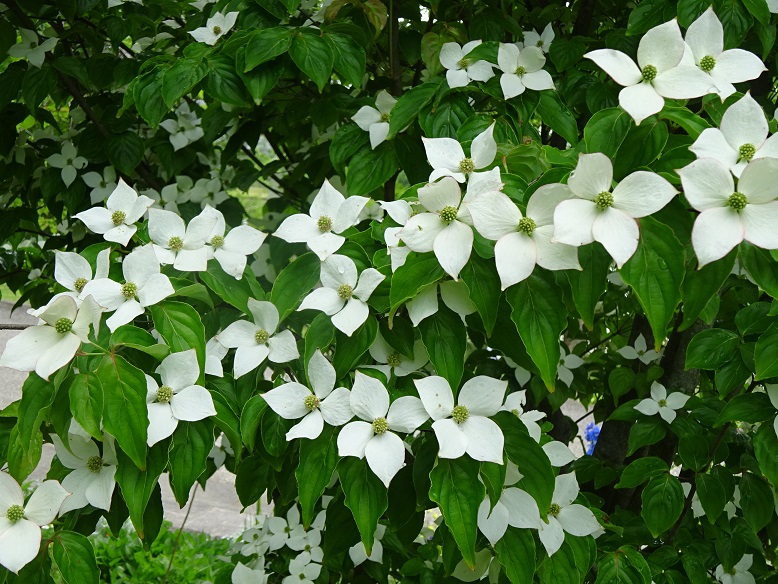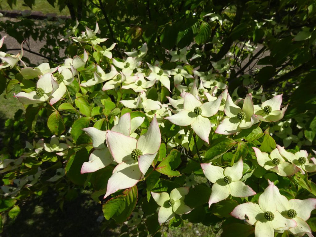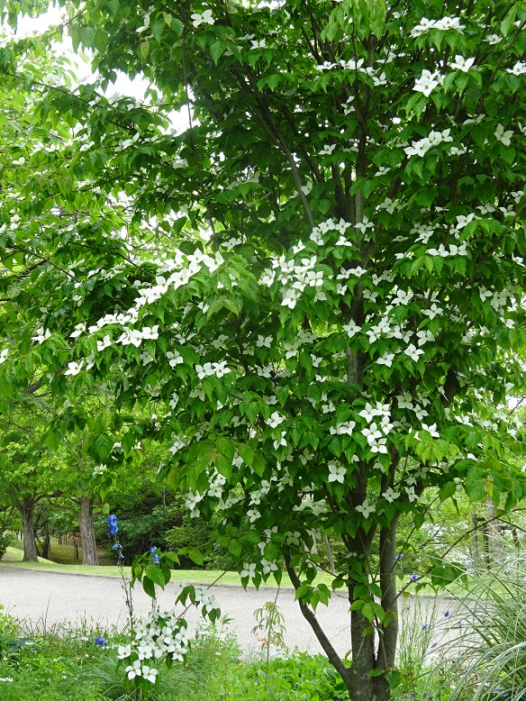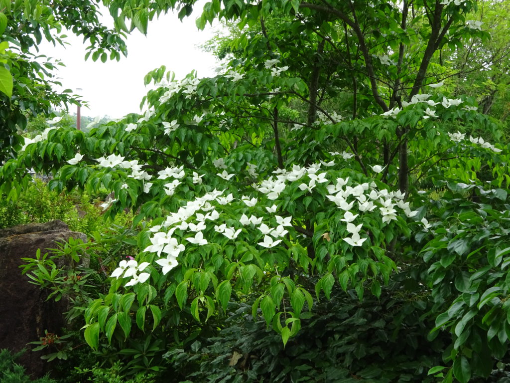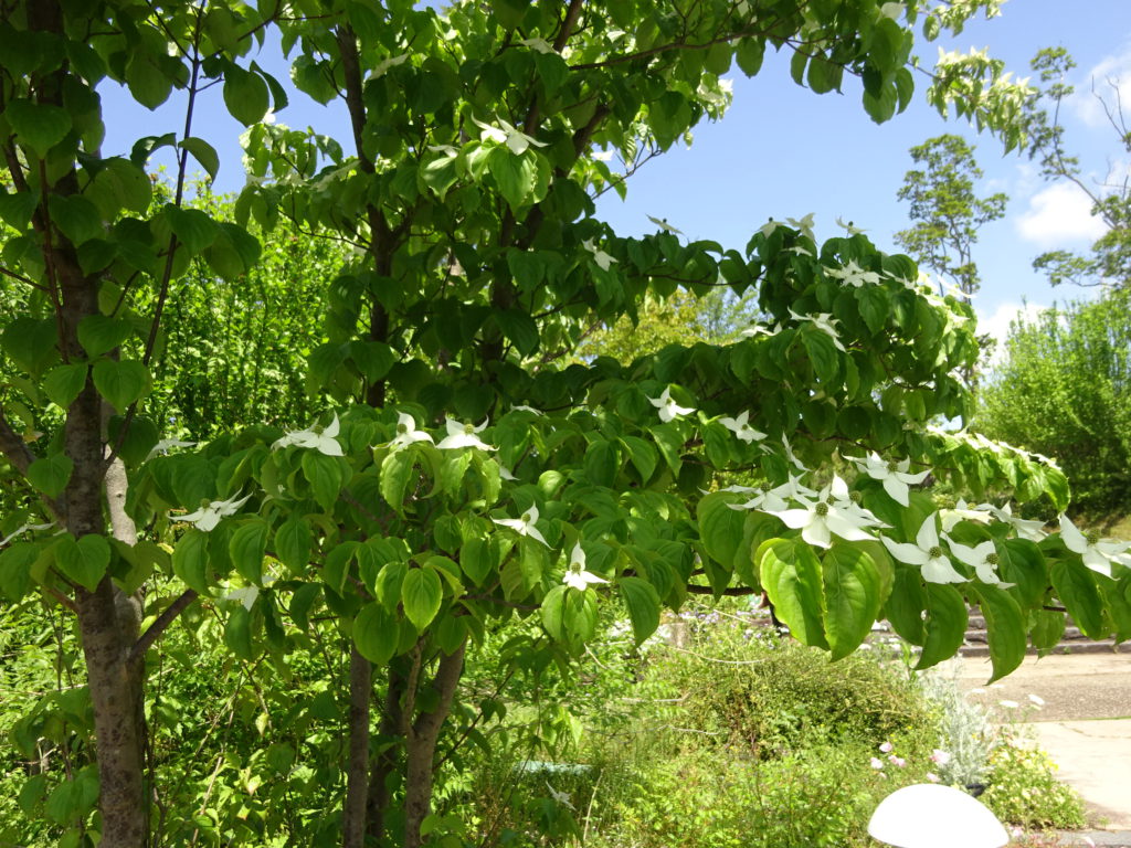 園内各所でヤマボウシが可憐に咲いています。