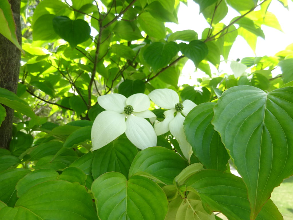 春の花が終わり、緑が濃くなってきた今日この頃、ヤマボウシの花がどこにいても見ることができます。