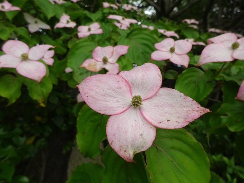 何気に歩いていたら淡いピンクを発見。よくみると以前見たヤマボウシ。
