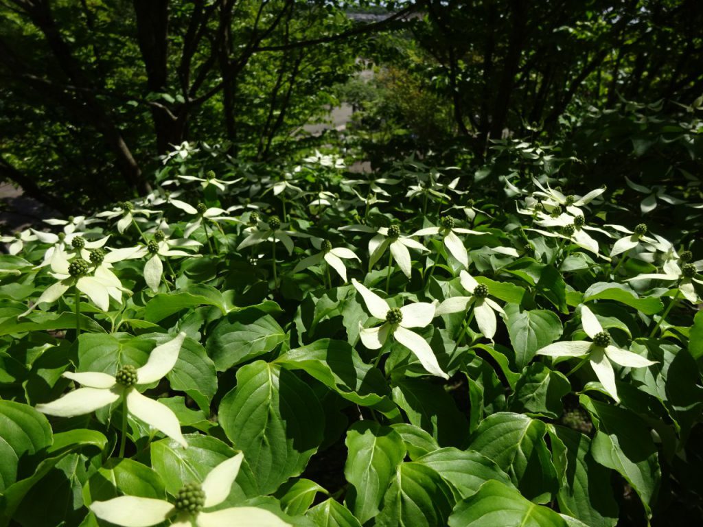 高い位置に咲くことが多いのですが、ここのヤマボウシは背が低く、花を近くで楽しめます。