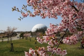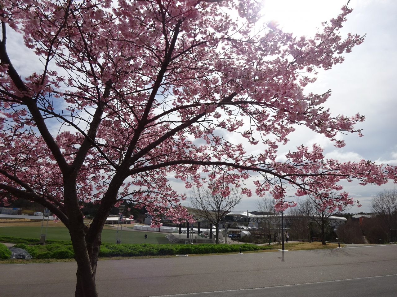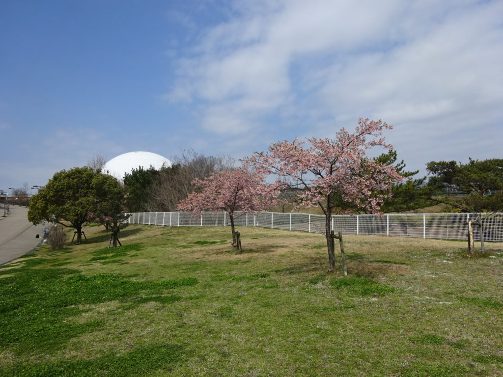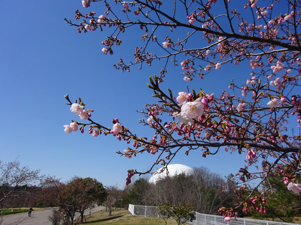 あいちサトラボと大芝生広場の間にあるヒガンザクラが開花しました。