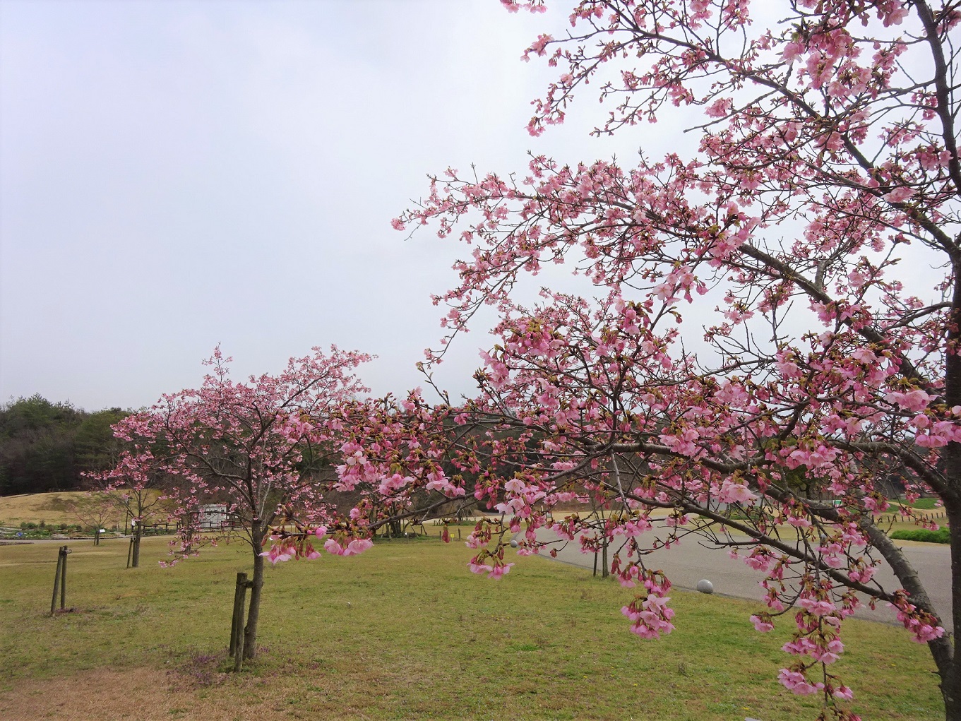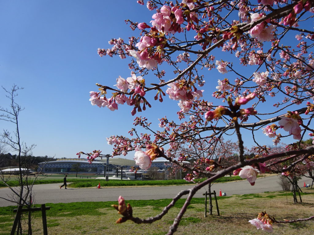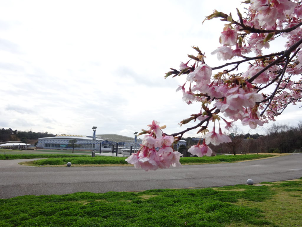 あいちサトラボと大芝生広場の間の園路脇のヒガンザクラが開花しました。