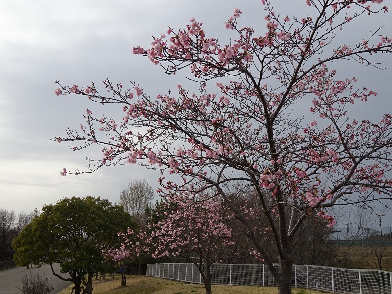 地球市民交流センターからあいちサトラボに向かう園路の脇に咲くヒガンザクラ、三分咲き位でしょうか?