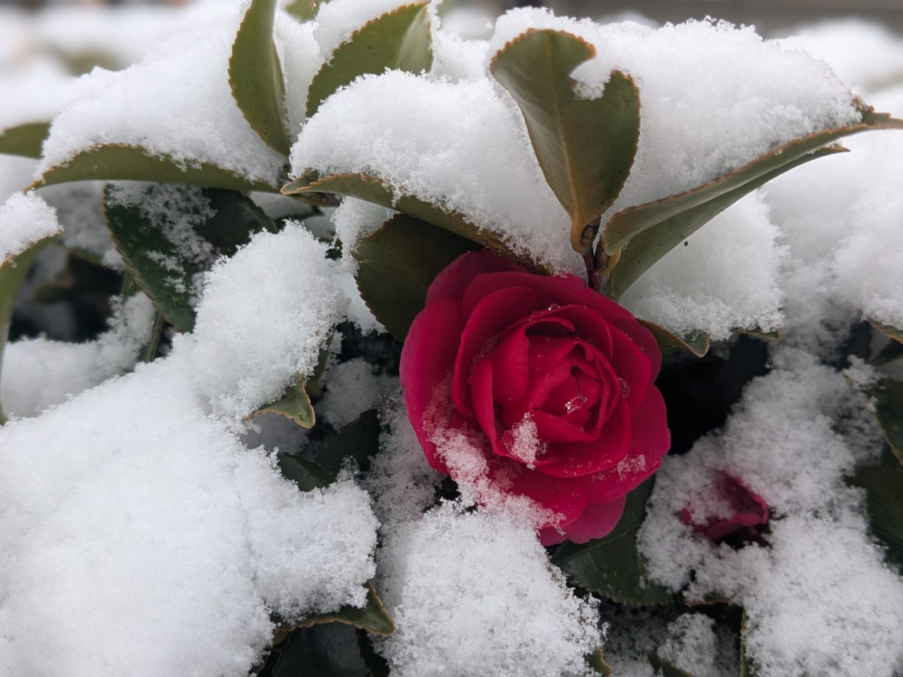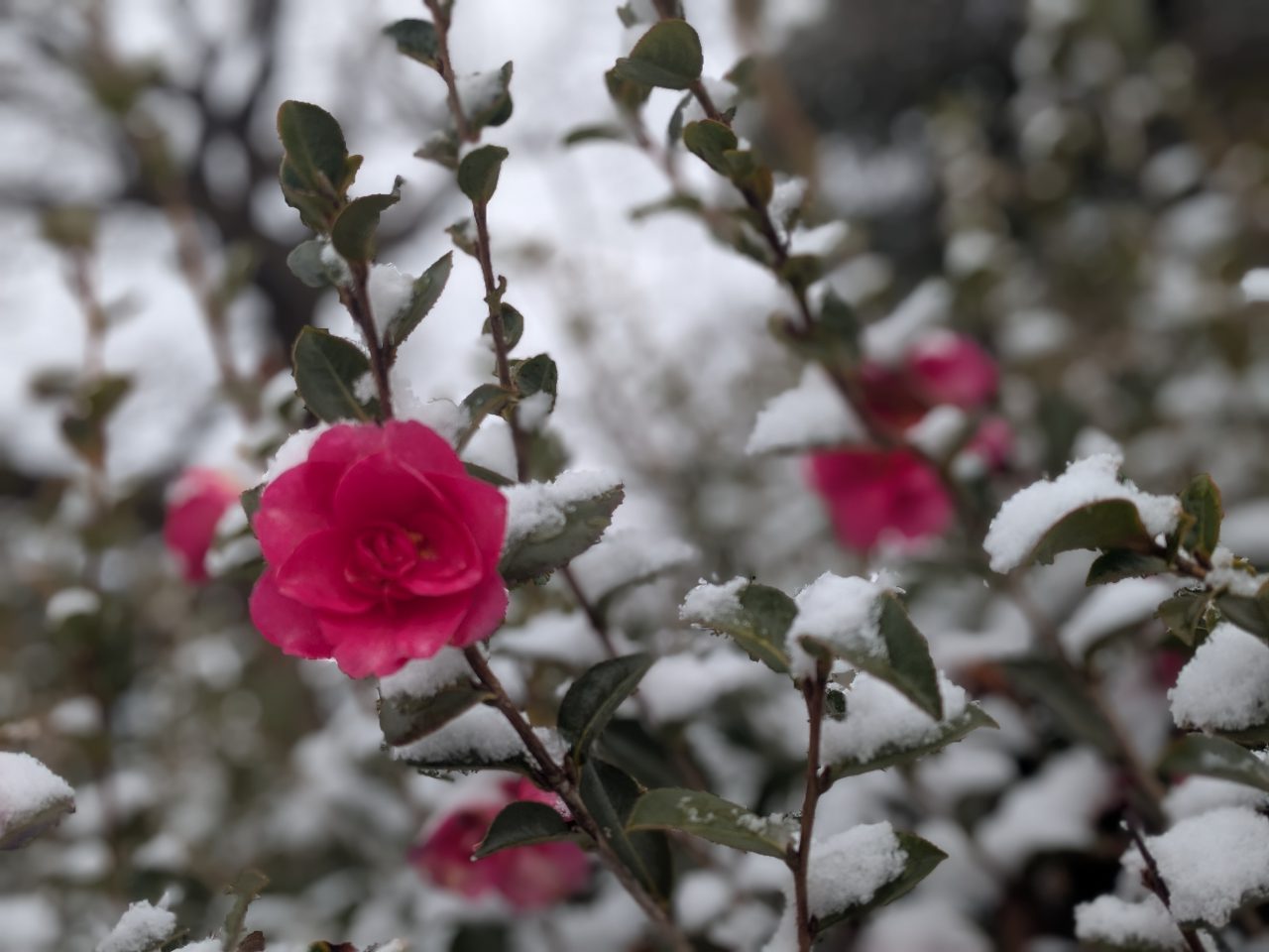 さざんかに雪がつもり、白とピンクのコントラストがきれい