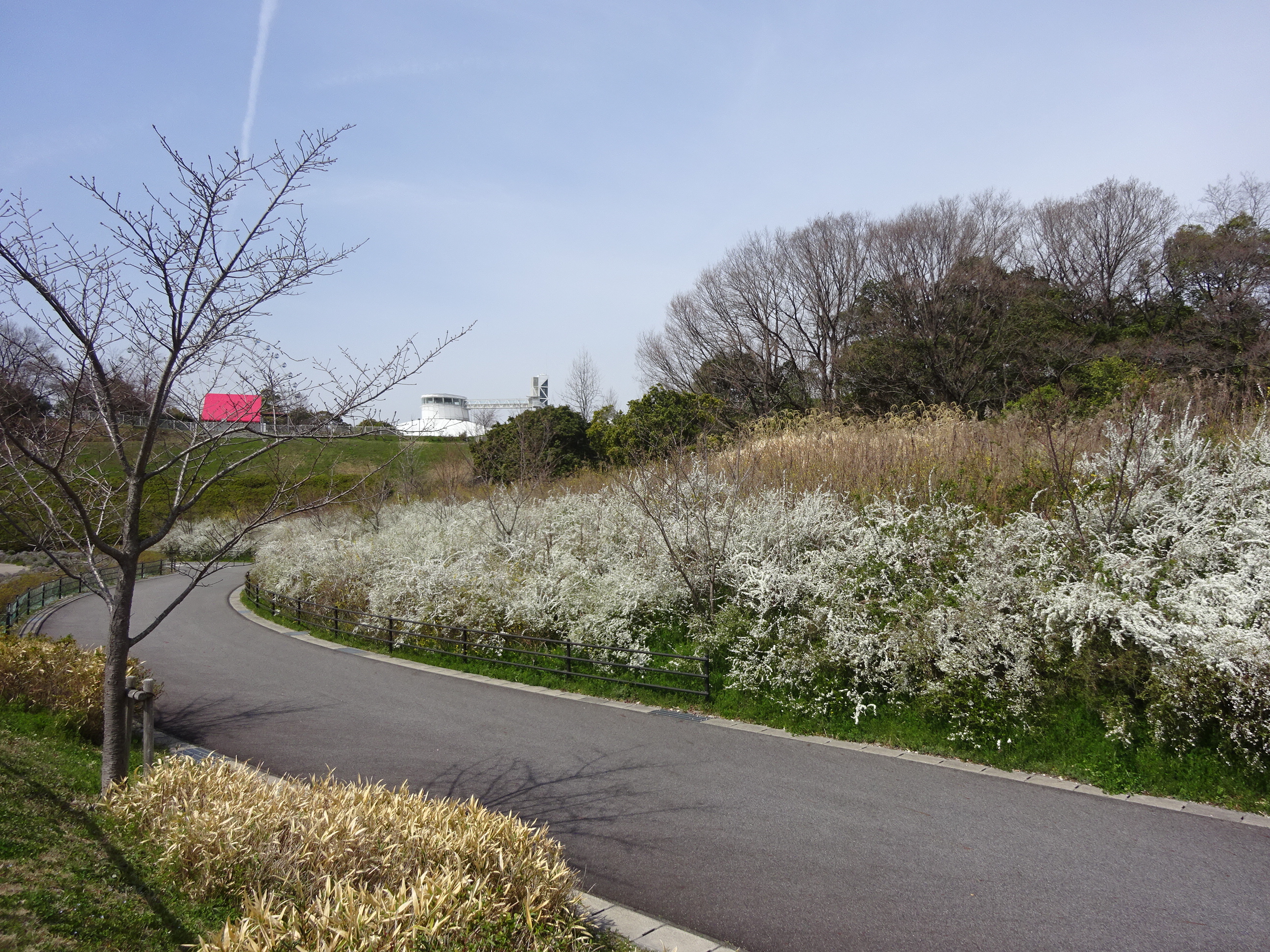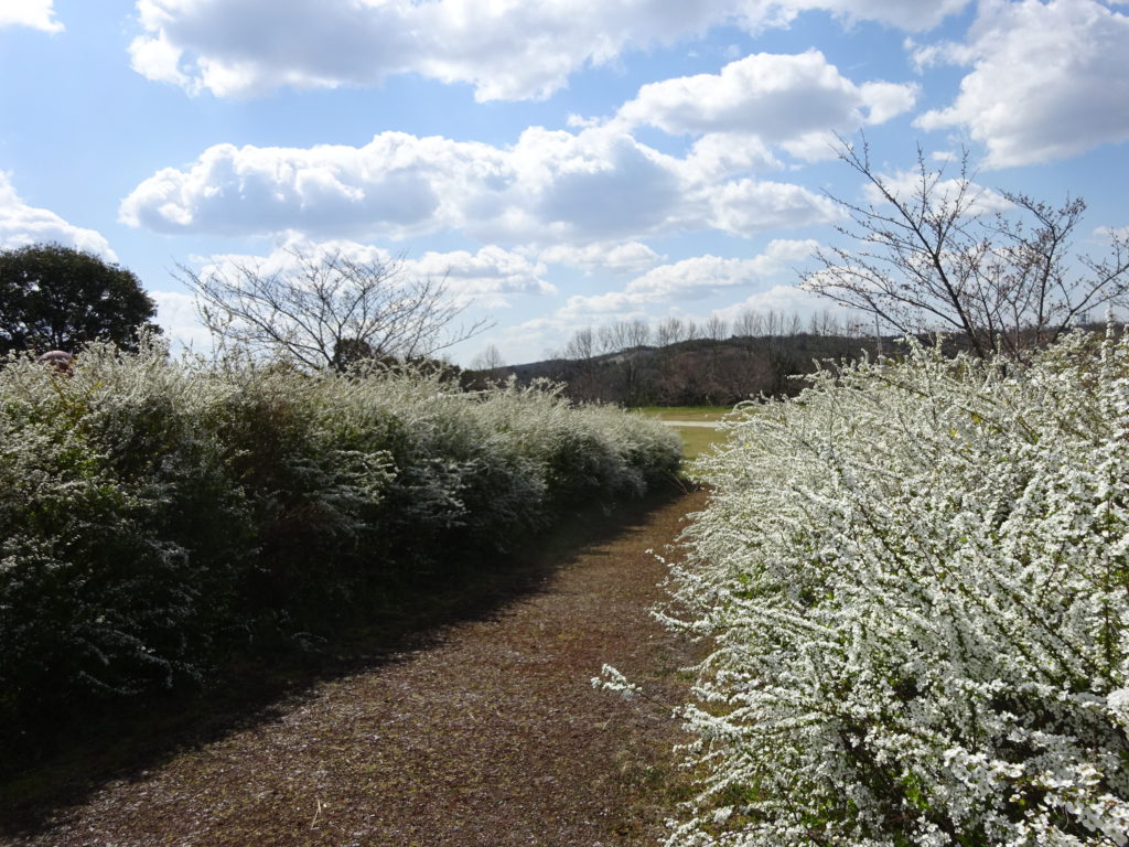 ユキヤナギの小路をぬけて芝生広場へ。