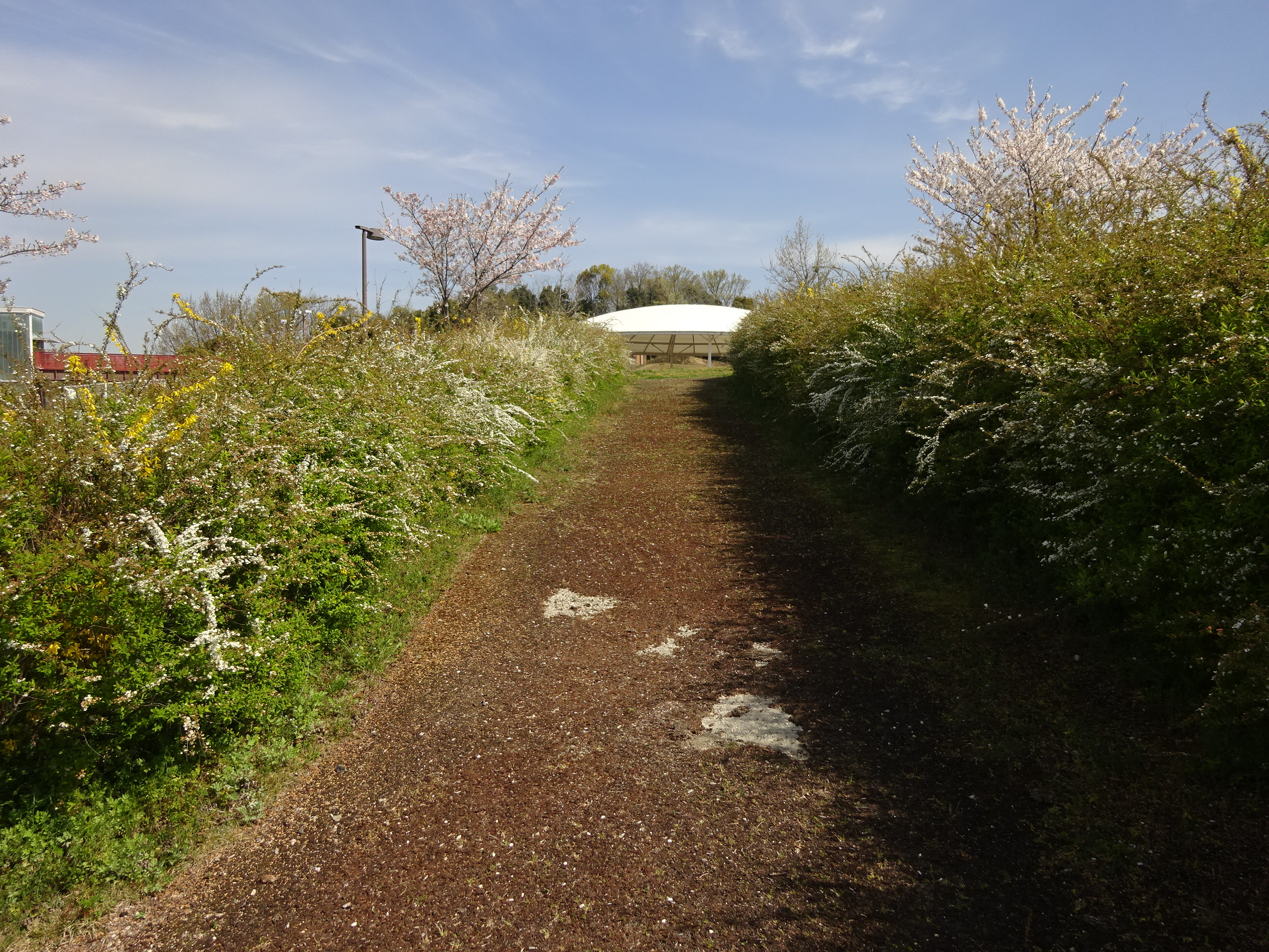 ユキヤナギの小路をぬけて芝生広場へ。
